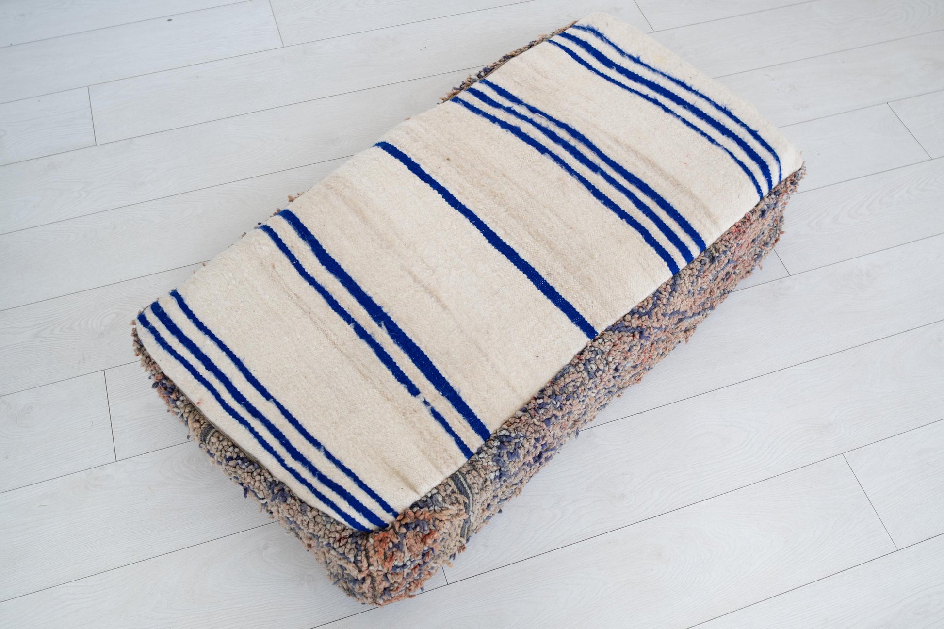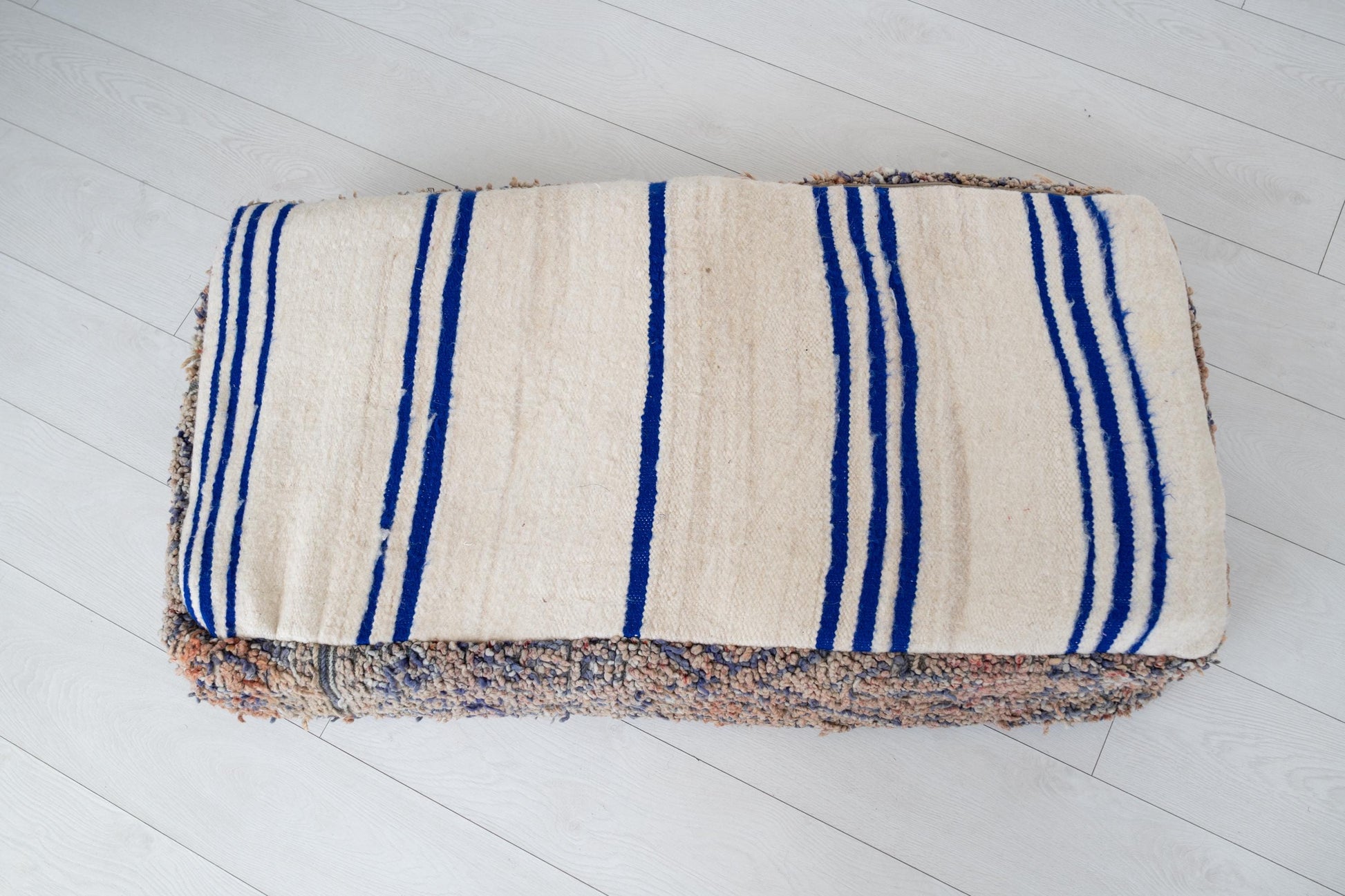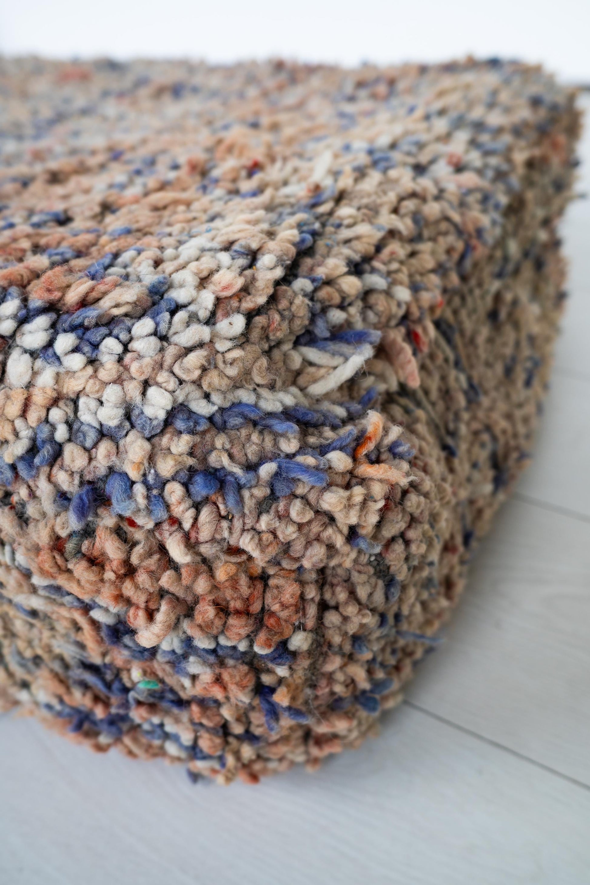 Add warmth, texture, and versatility to your space with this handmade Moroccan pouf, crafted from repurposed vintage wool rugs in soft purple/blues, pinks, and beige. The tribal motifs and woven texture reflect generations of Berber artistry, making each pouf a one-of-a-kind statement. Use it as extra seating in a cozy corner, a relaxed footrest, a meditation cushion, or a stylish pet bed.
