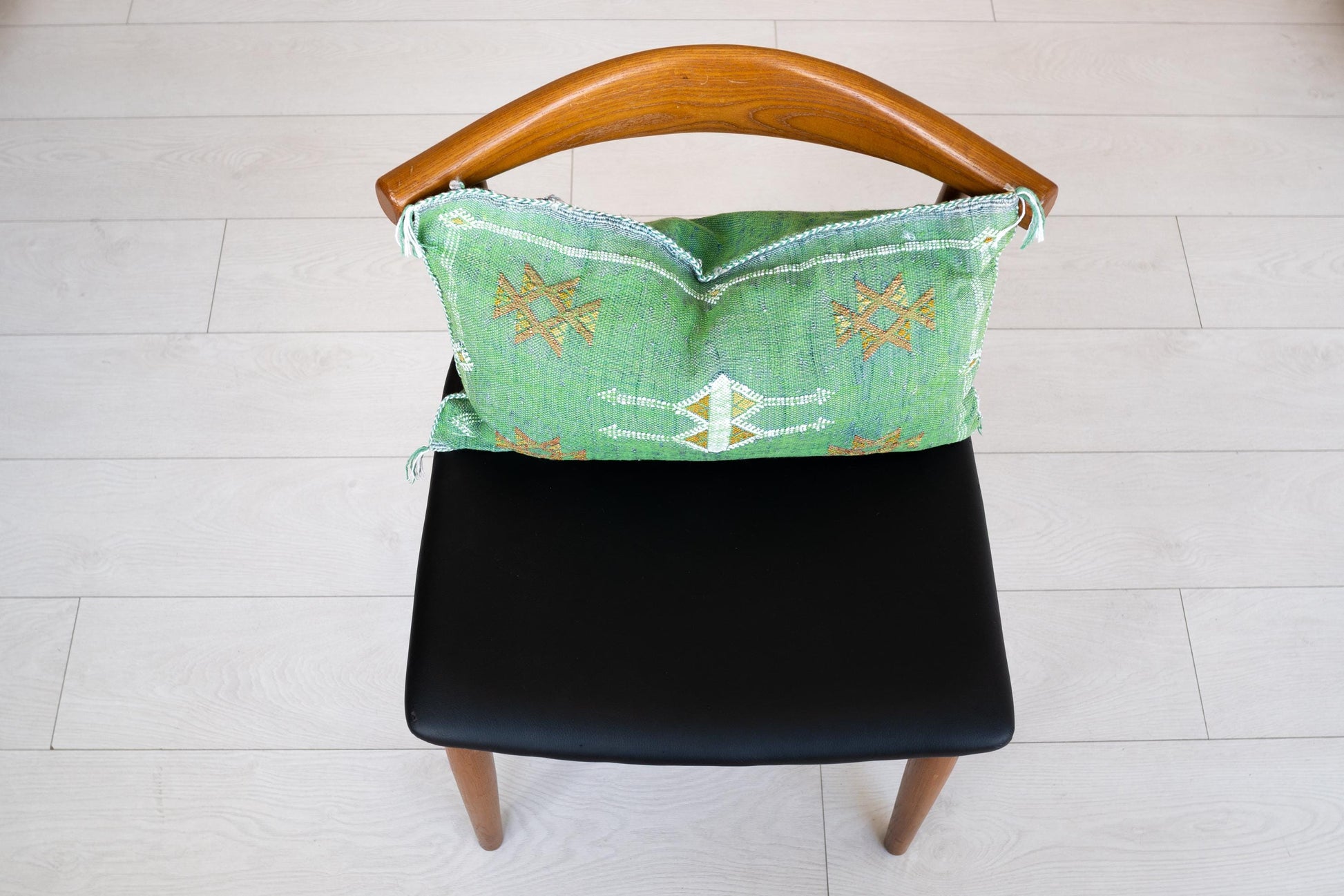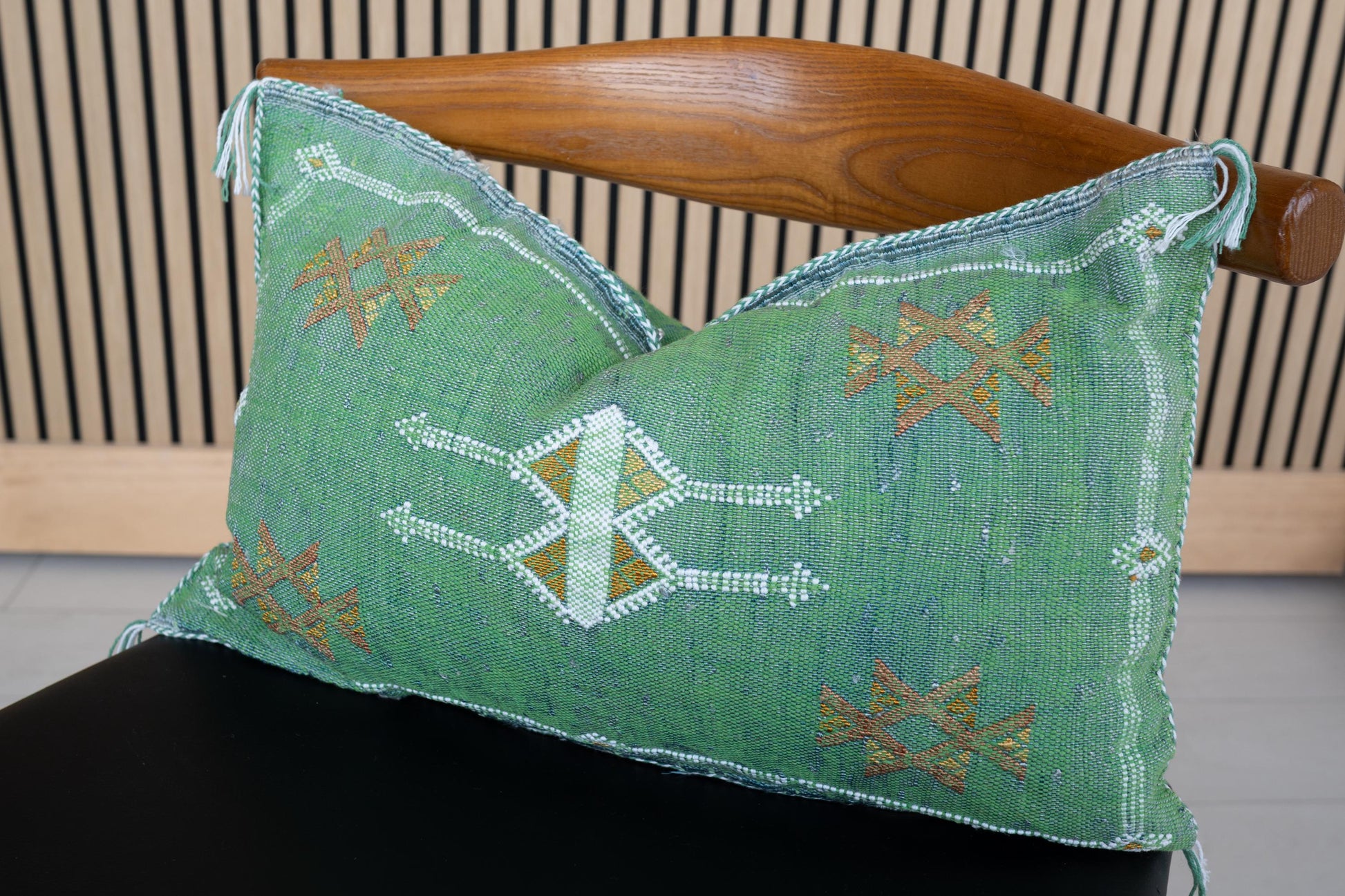 Green Cactus Silk Lumbar Pillow | Handwoven Moroccan Sabra Cushion | Boho Berber Decor