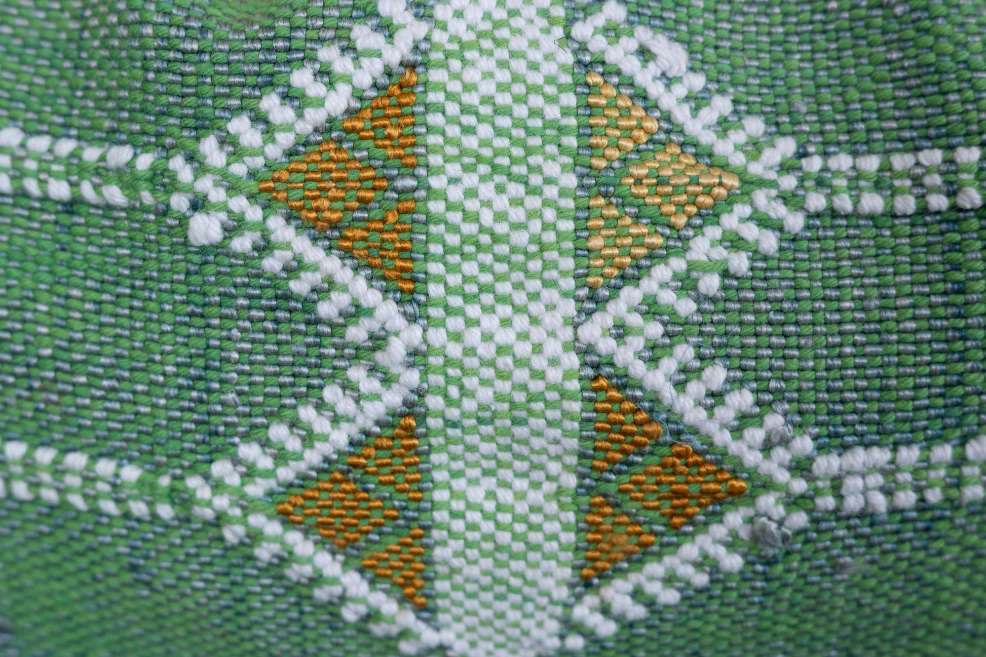 Brighten your space with this handcrafted sabra cactus silk pillow, dyed a serene olive green and detailed with traditional Berber symbols in ivory and warm golden hues. The hand-loomed texture, silky matte finish, and braided edging with tassel corners give it a distinct character rooted in Moroccan craftsmanship.