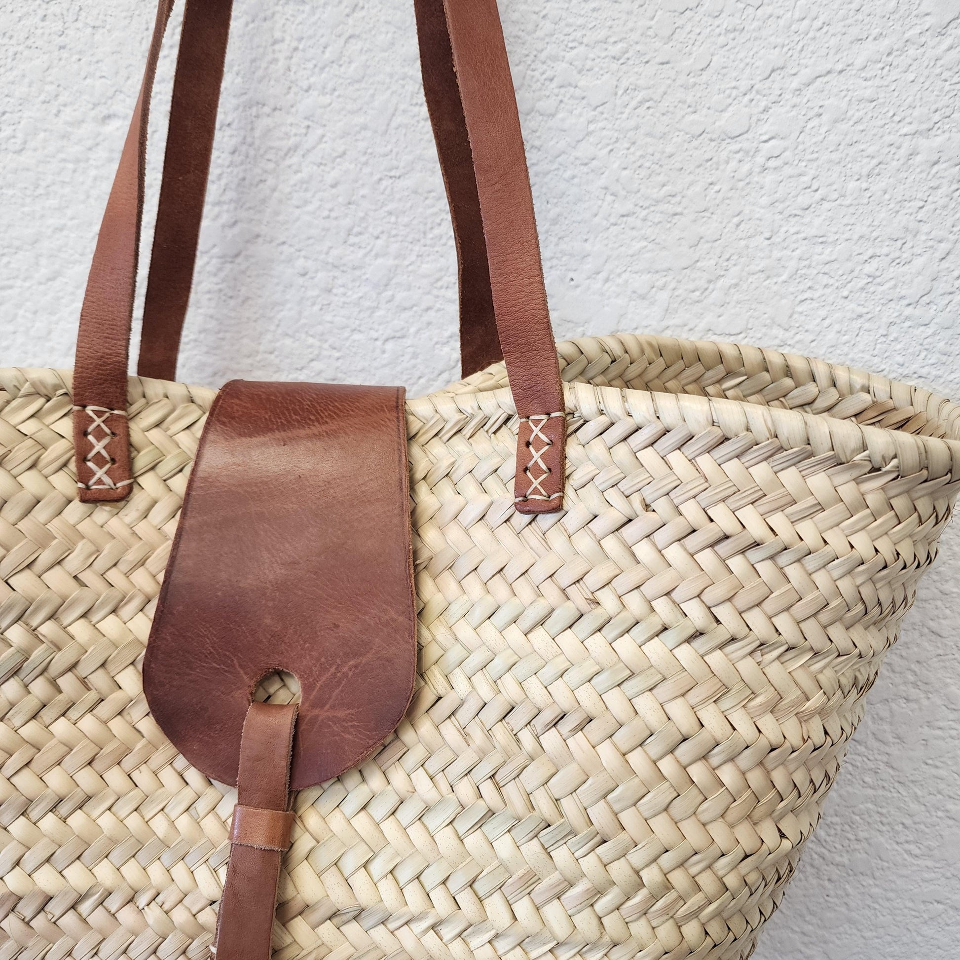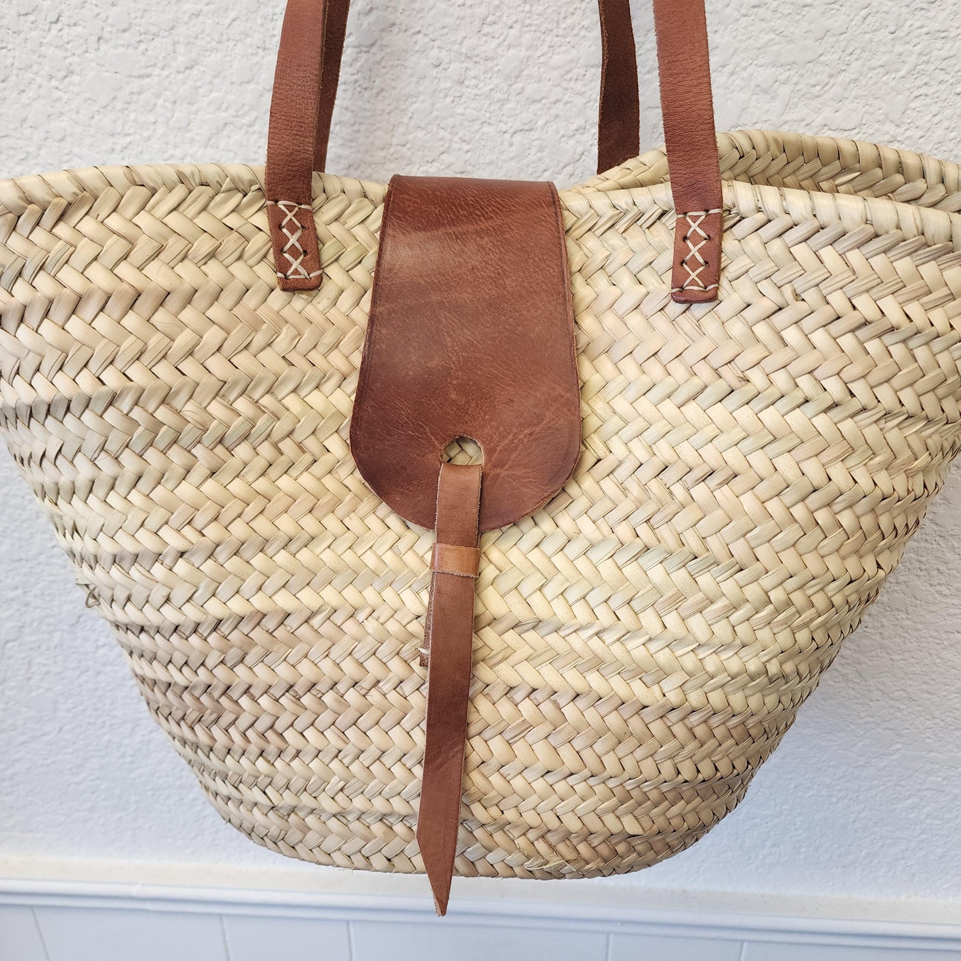 Handcrafted Moroccan Woven Market Basket with Leather Straps - Large Size Shopping Tote for Farmers Markets, French style market tote