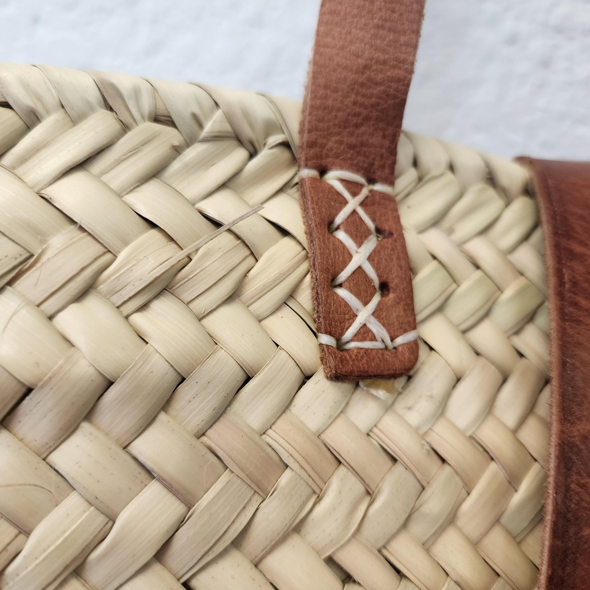 - Materials: 100% natural palm leaf & genuine Moroccan leather