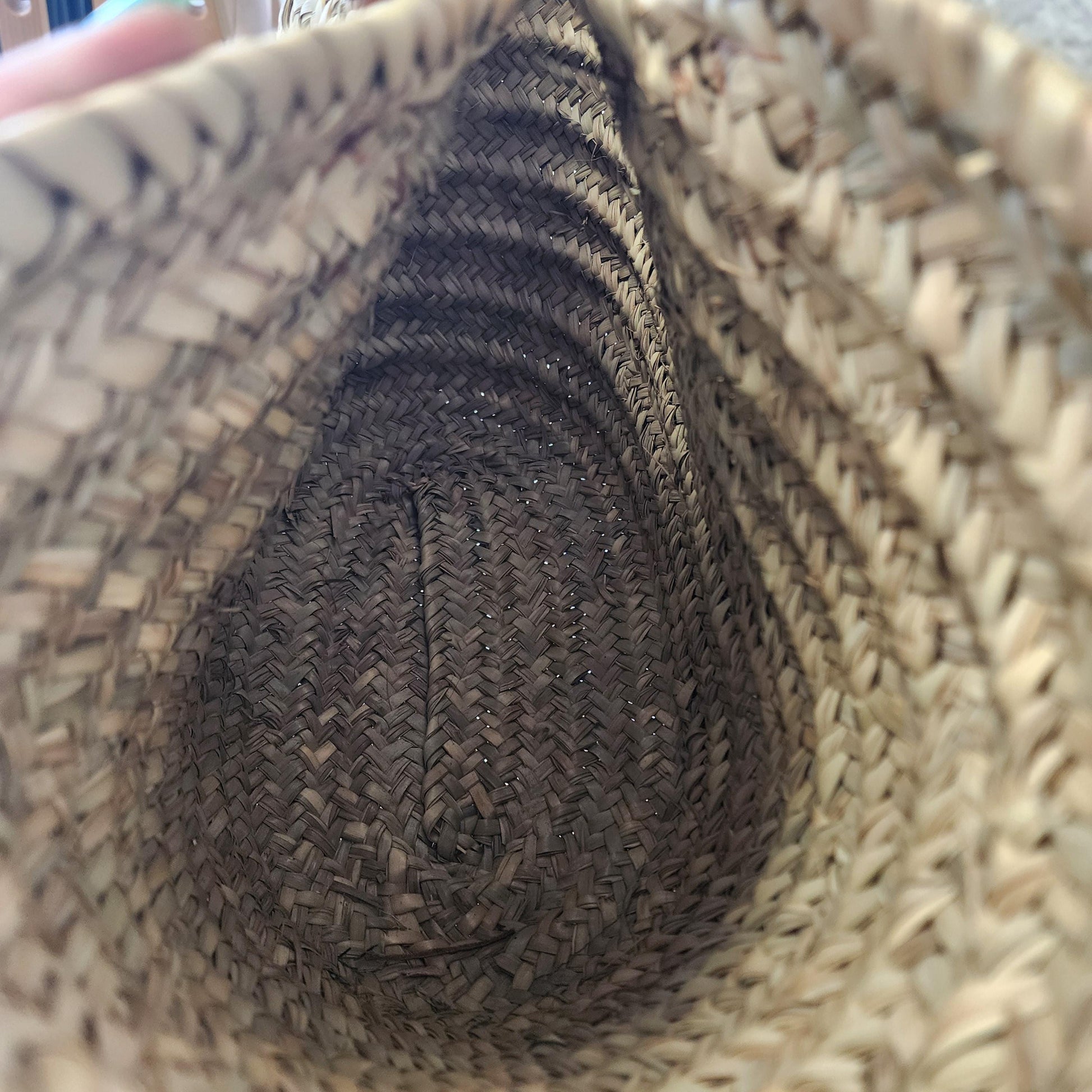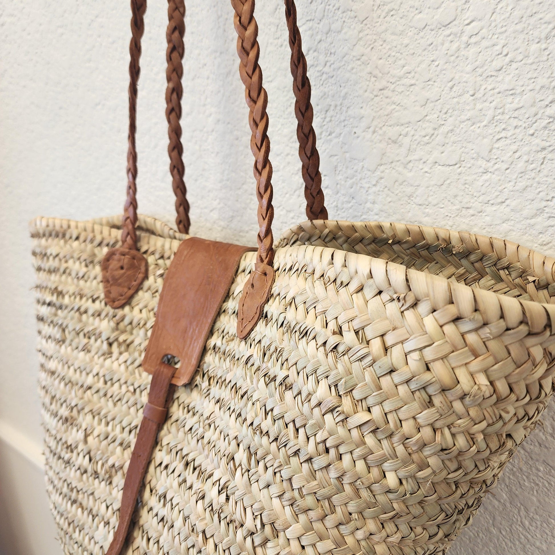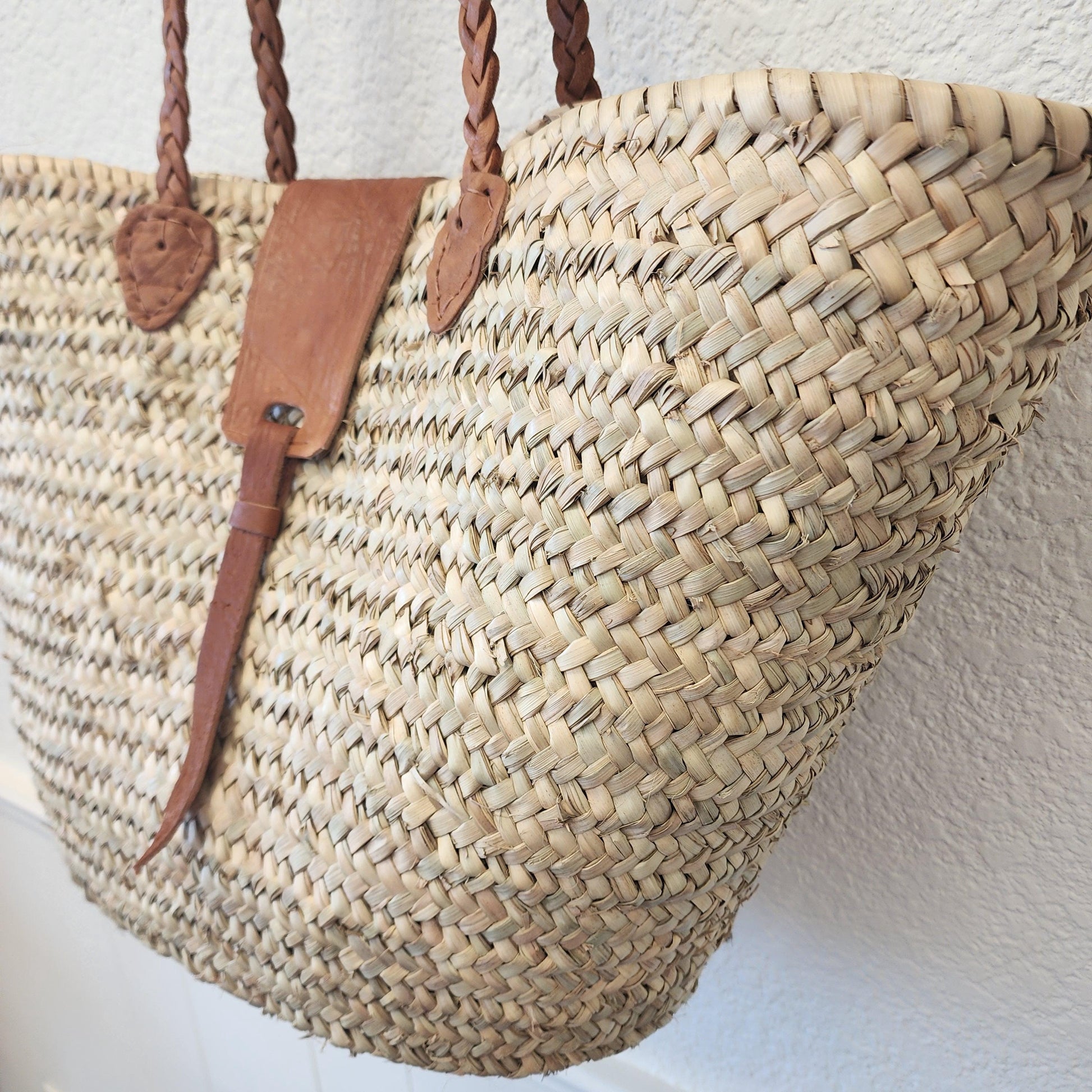 Handcrafted Moroccan Woven Market Basket with Leather Straps - Large Size Shopping Tote for Farmers Markets, French style market tote
