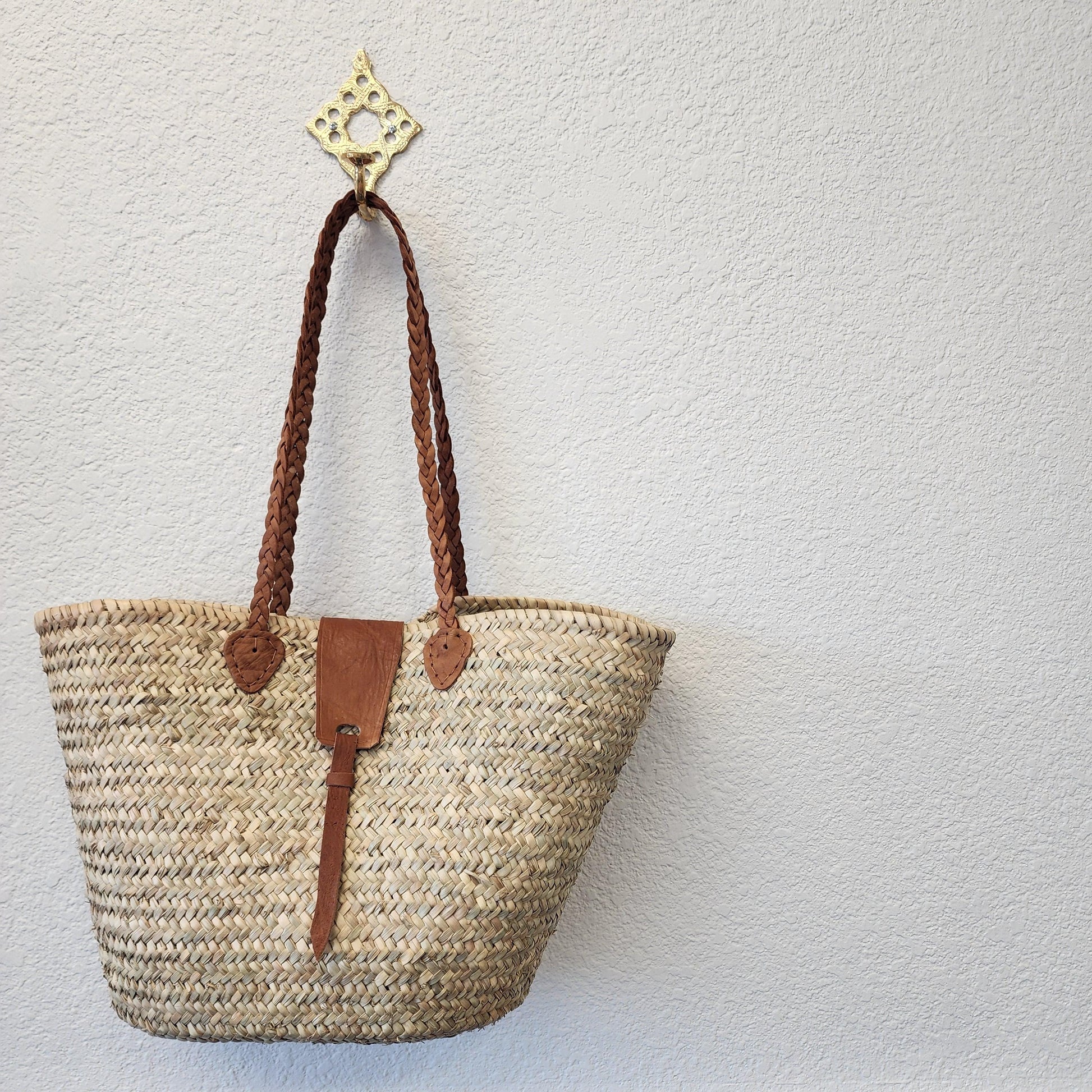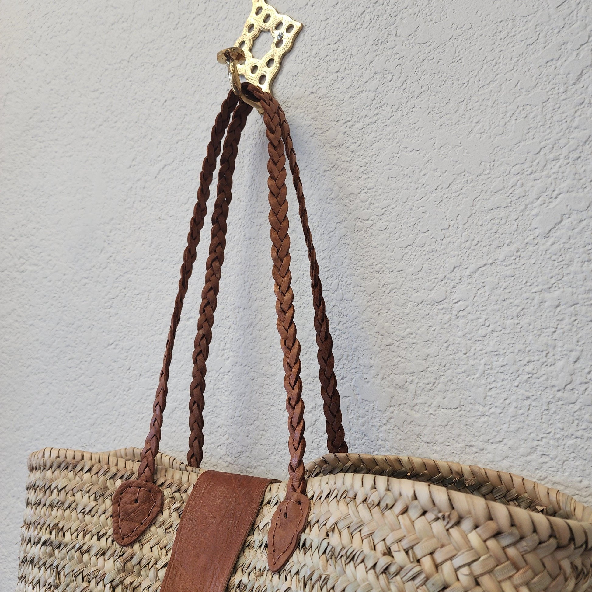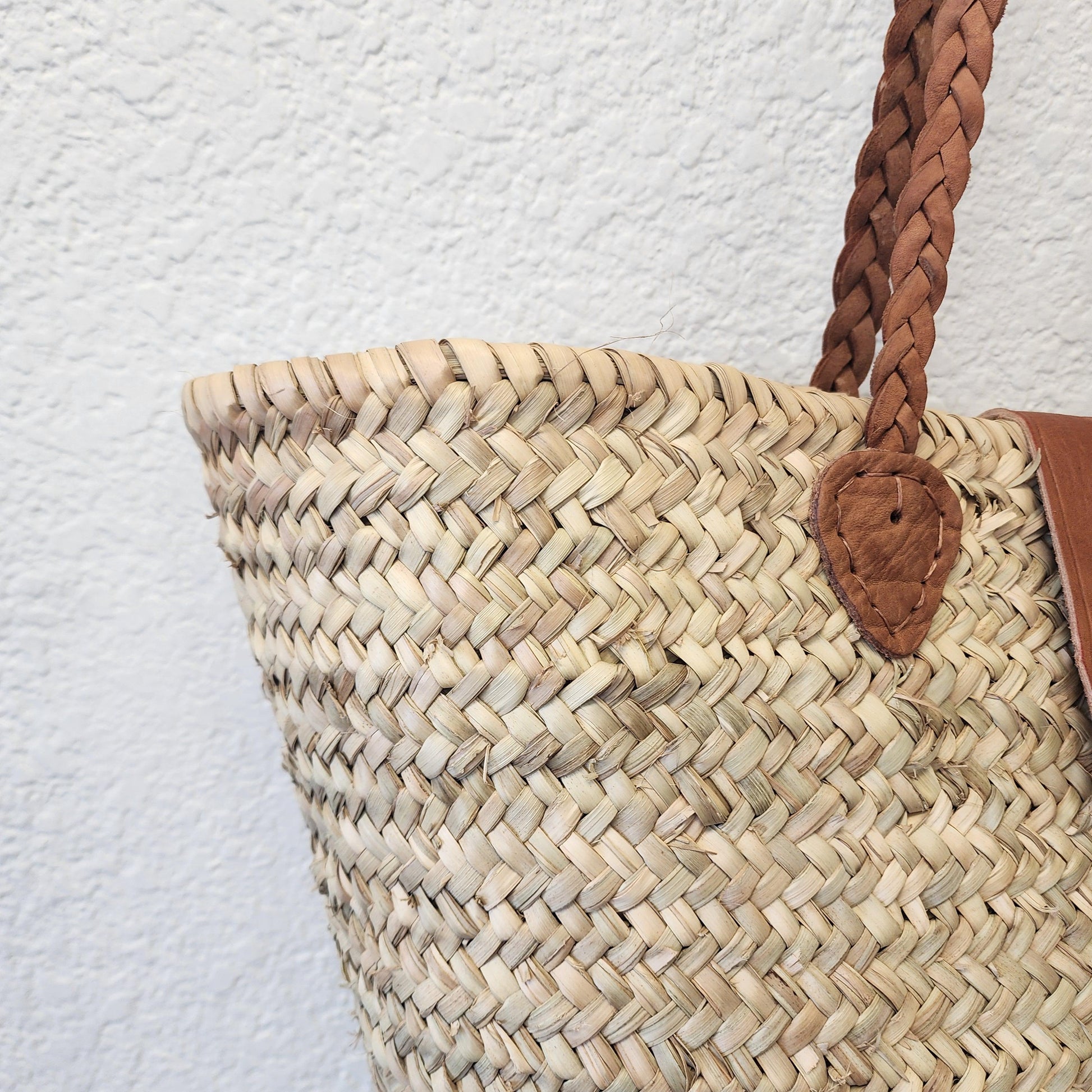 - Materials: 100% natural palm leaf & genuine Moroccan leather