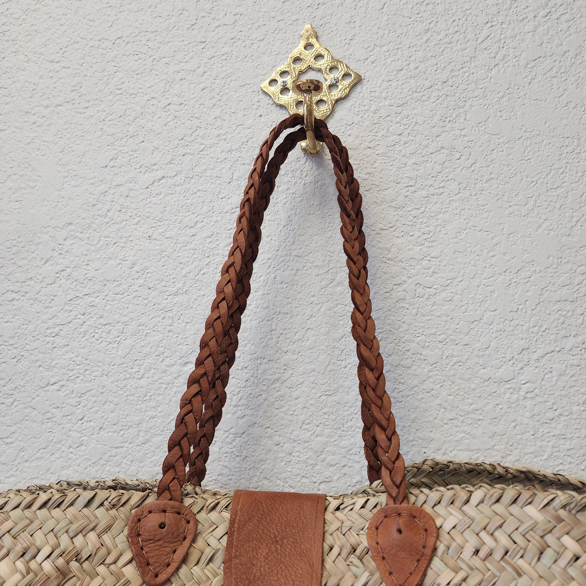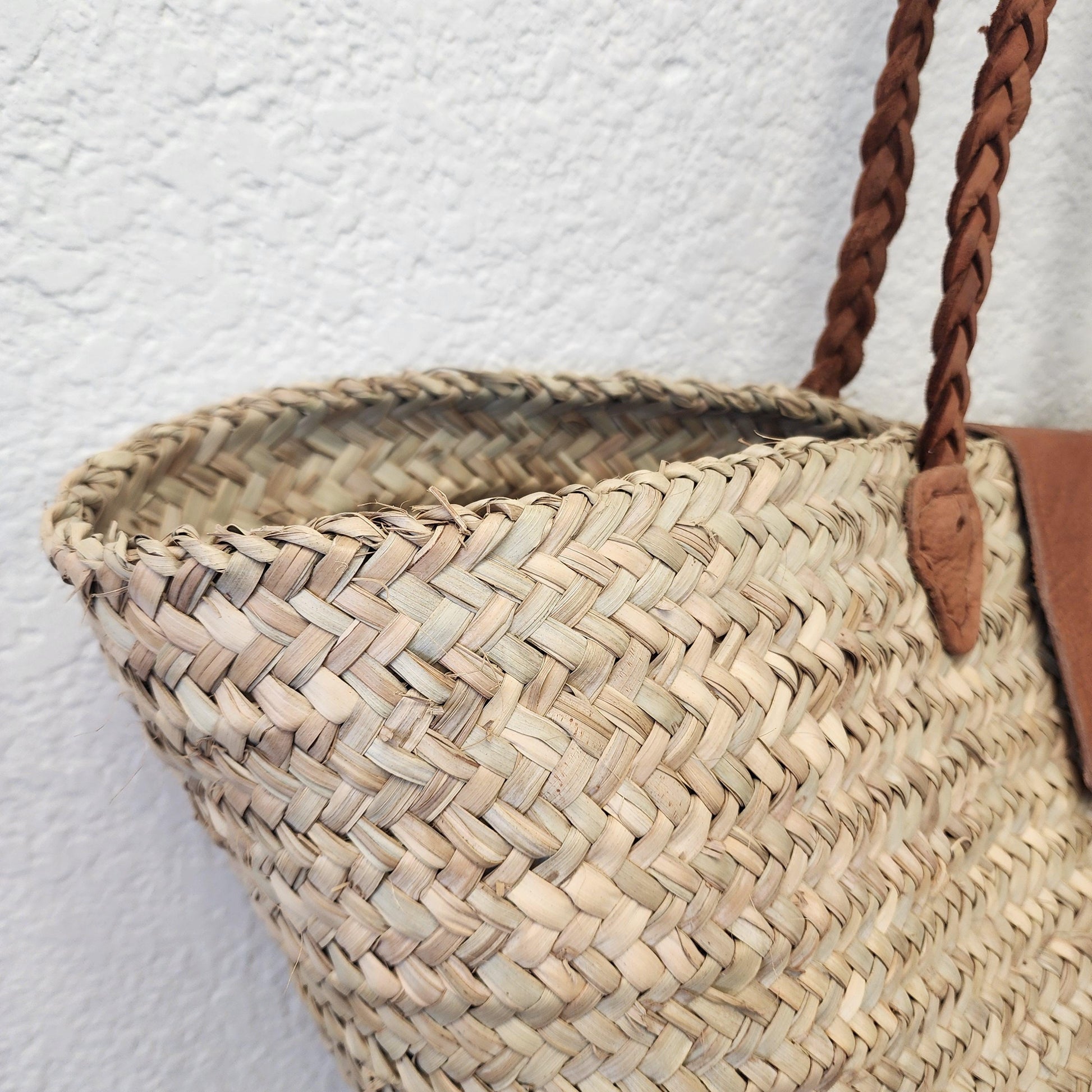- Materials: 100% natural palm leaf & genuine Moroccan leather