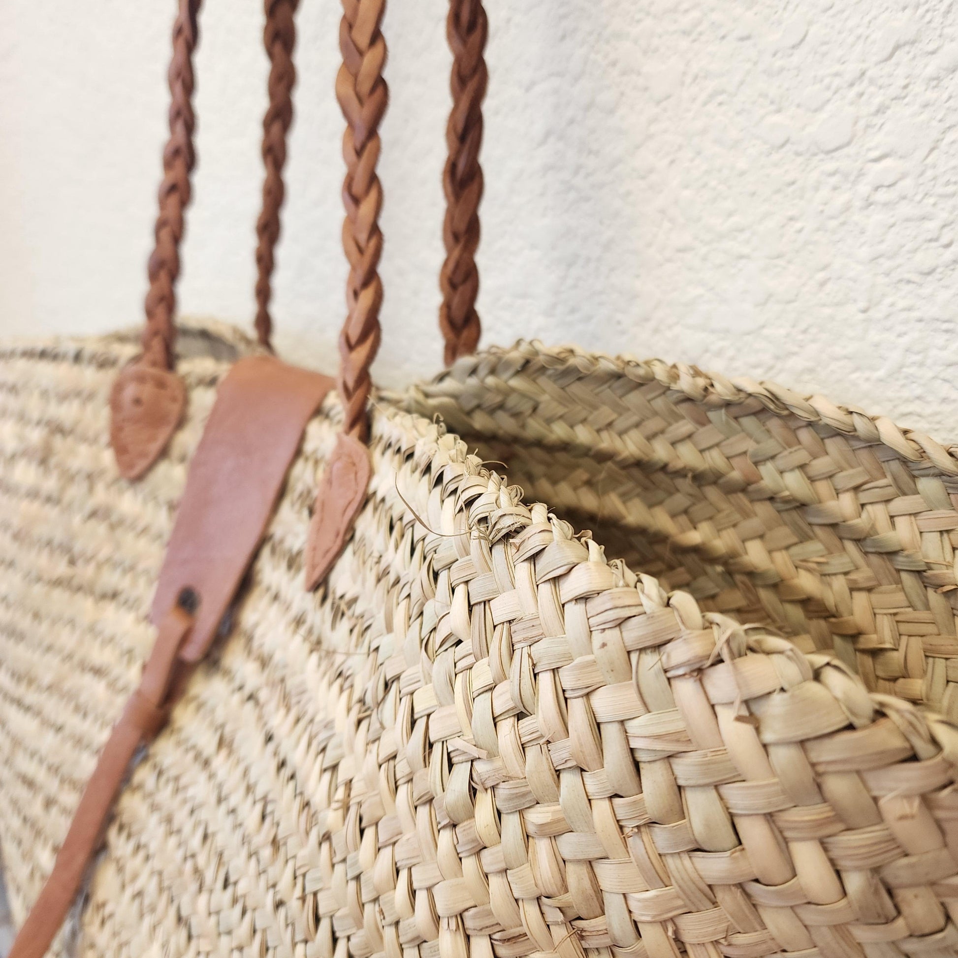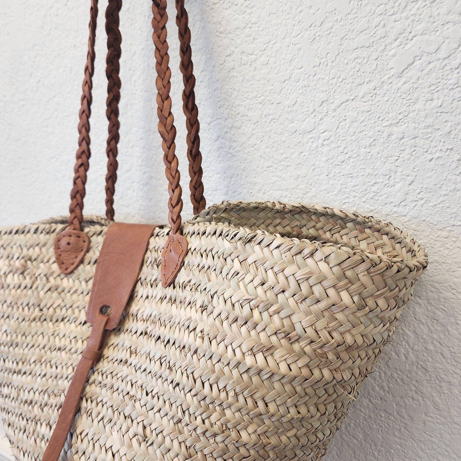 Handcrafted Moroccan Woven Market Basket with Leather Straps - Large Size Shopping Tote for Farmers Markets, French style market tote