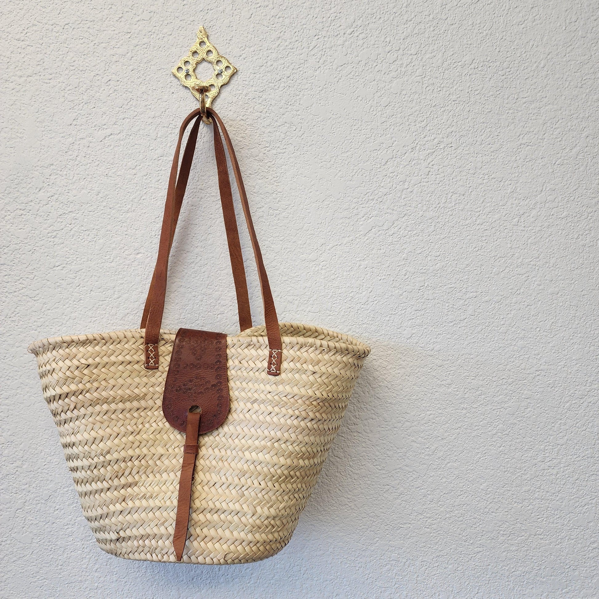 Handcrafted Moroccan Woven Market Basket with Leather Straps - Large Size Shopping Tote for Farmers Markets, French style market tote
