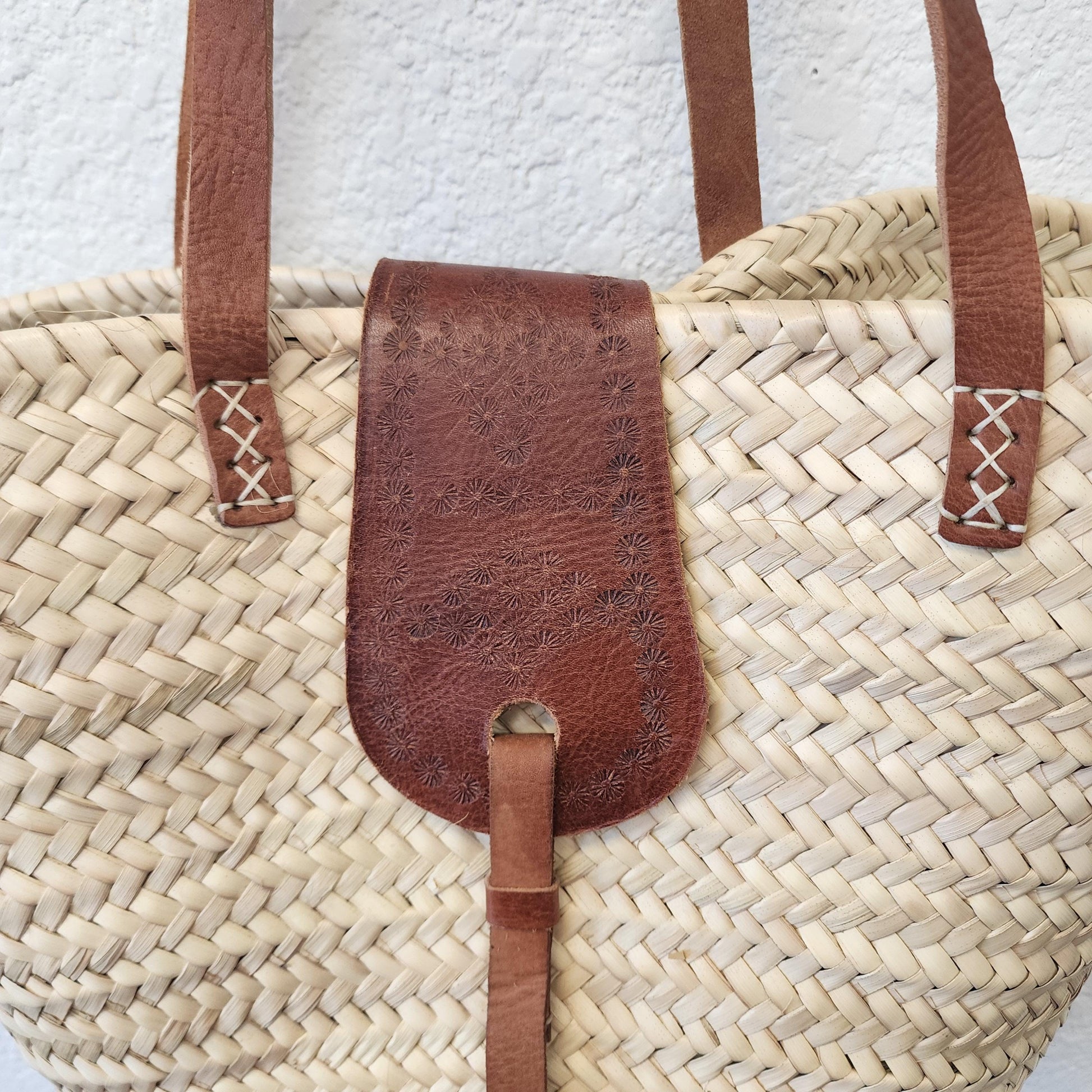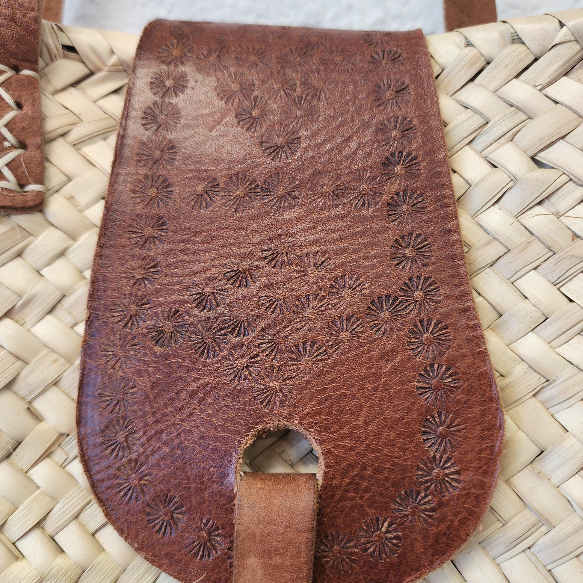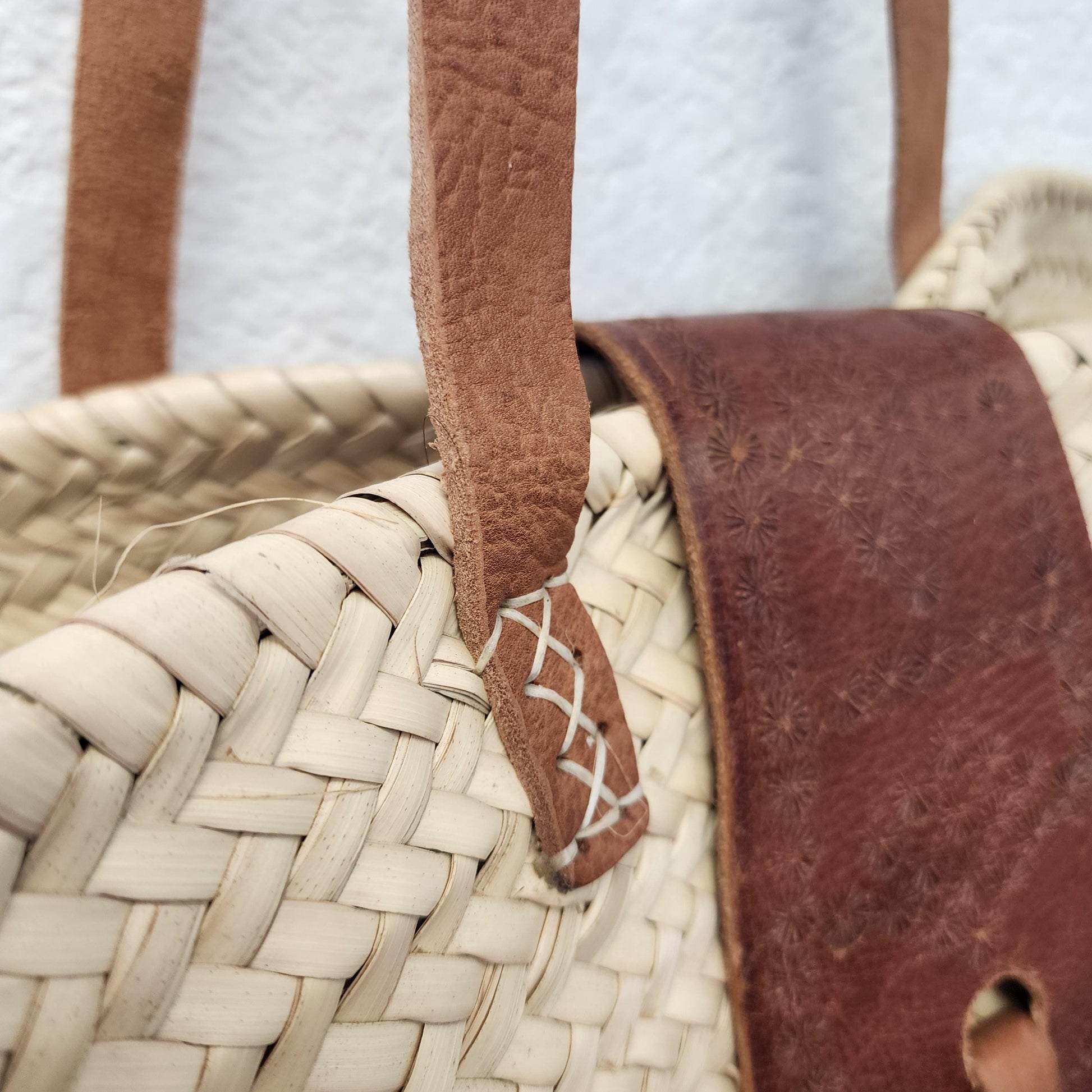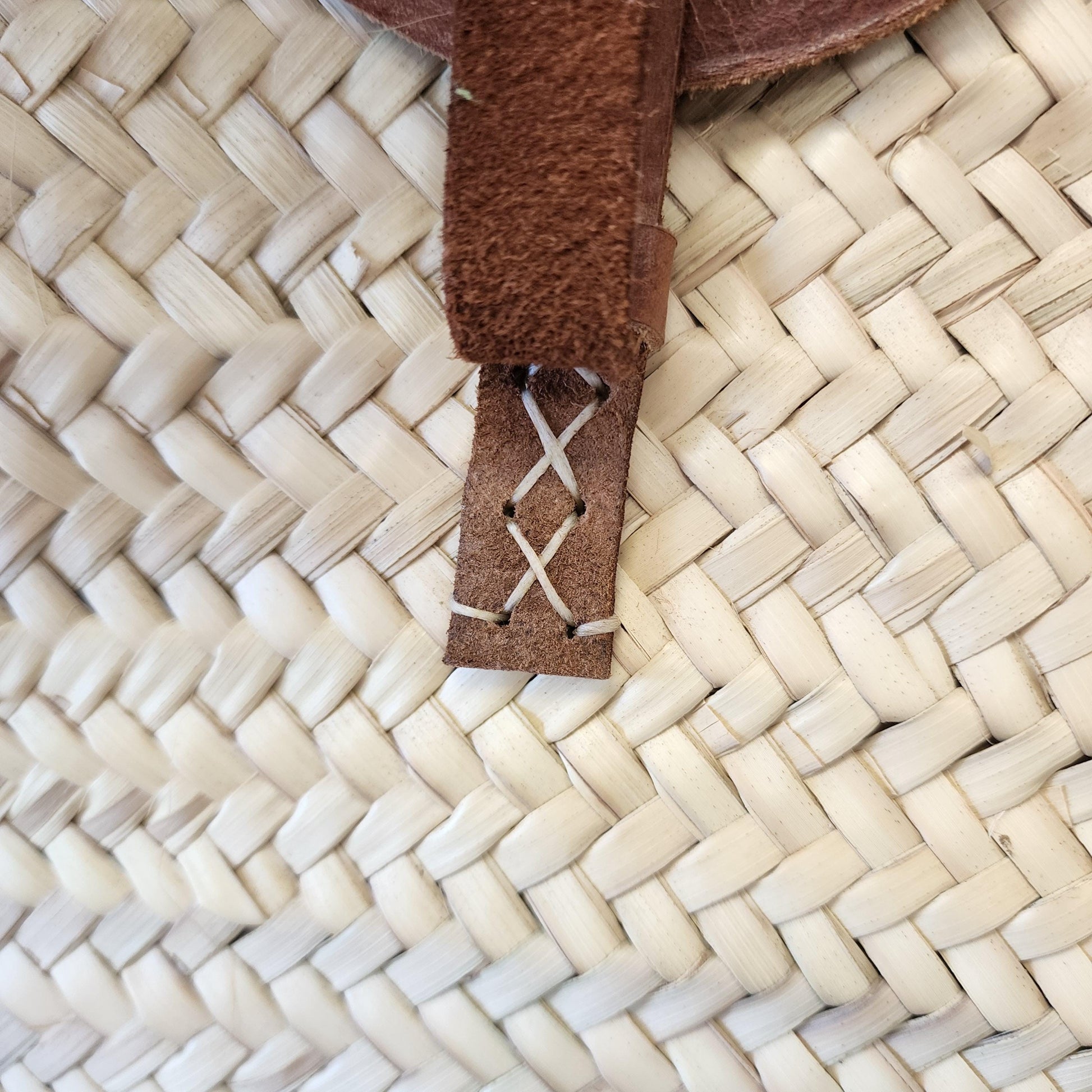 - Materials: 100% natural palm leaf & genuine Moroccan leather