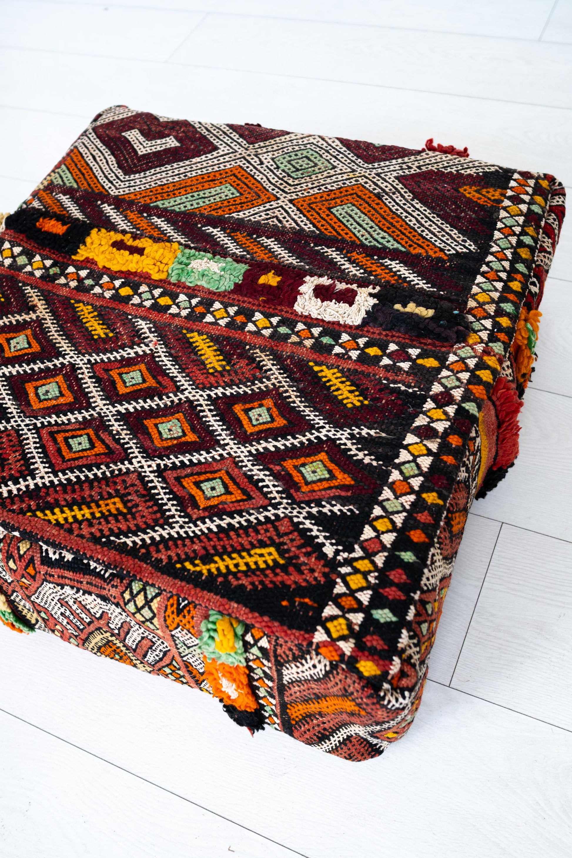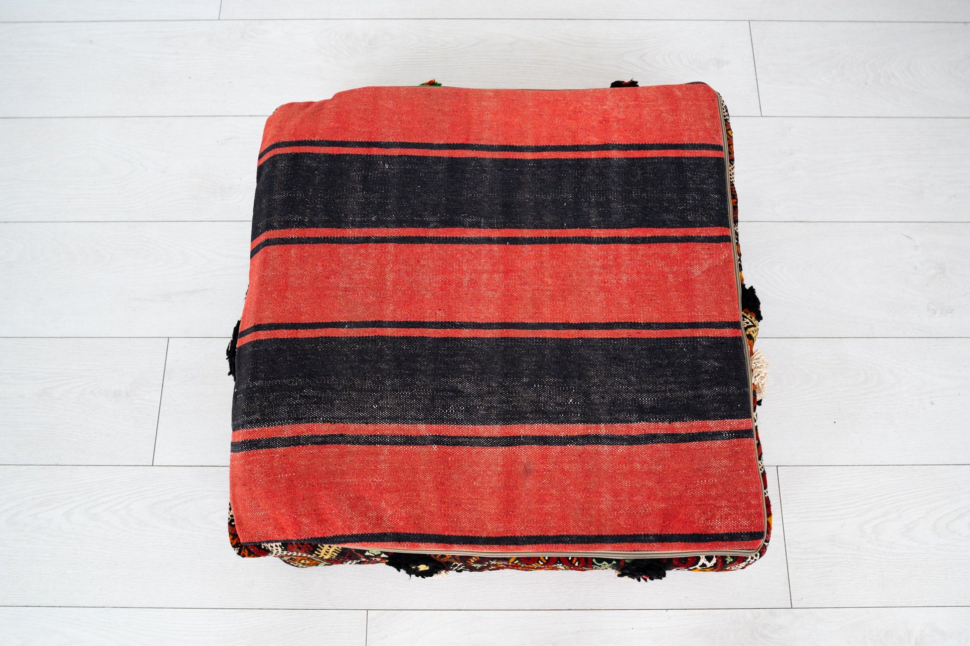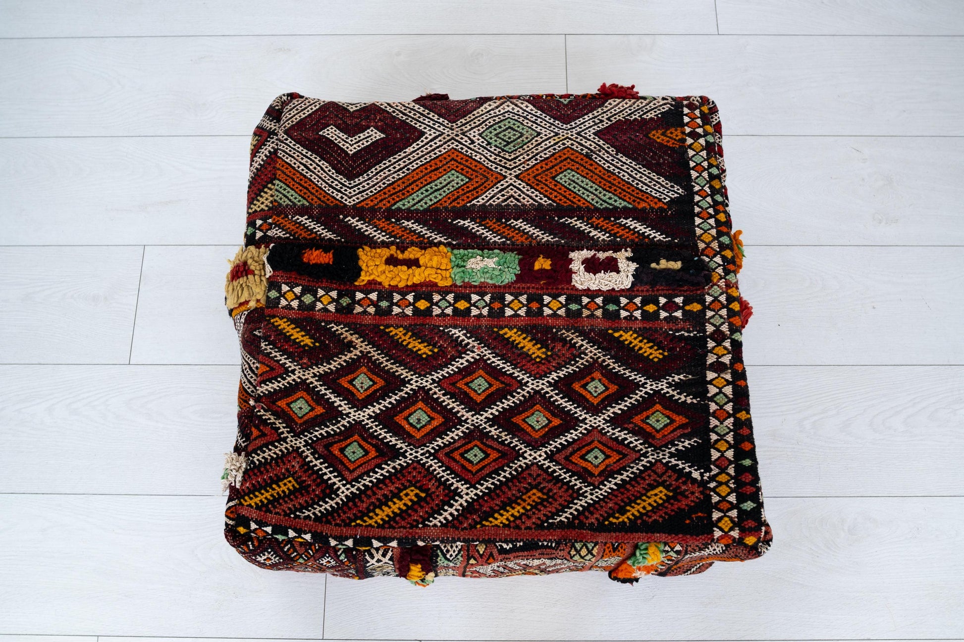 Infuse your home with warmth and versatility through this handmade Moroccan floor pouf. Sized at 24"x24"x8", it's crafted from upcycled vintage wool rugs and designed for flexible, stylish living. The earthy tones and tribal motifs bring soulful character to any room—perfect for cozy corners, curated lounges, or sunlit studios.