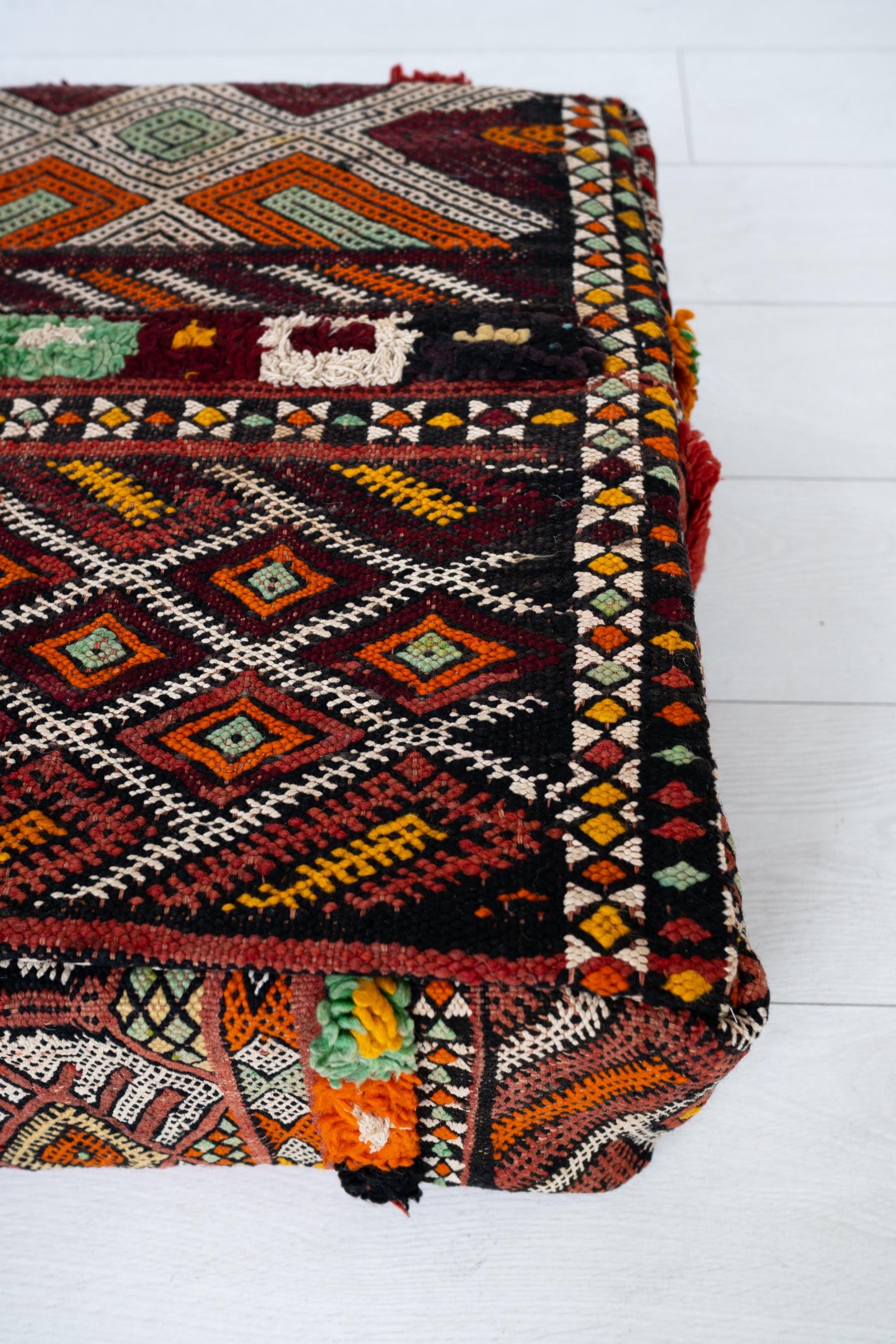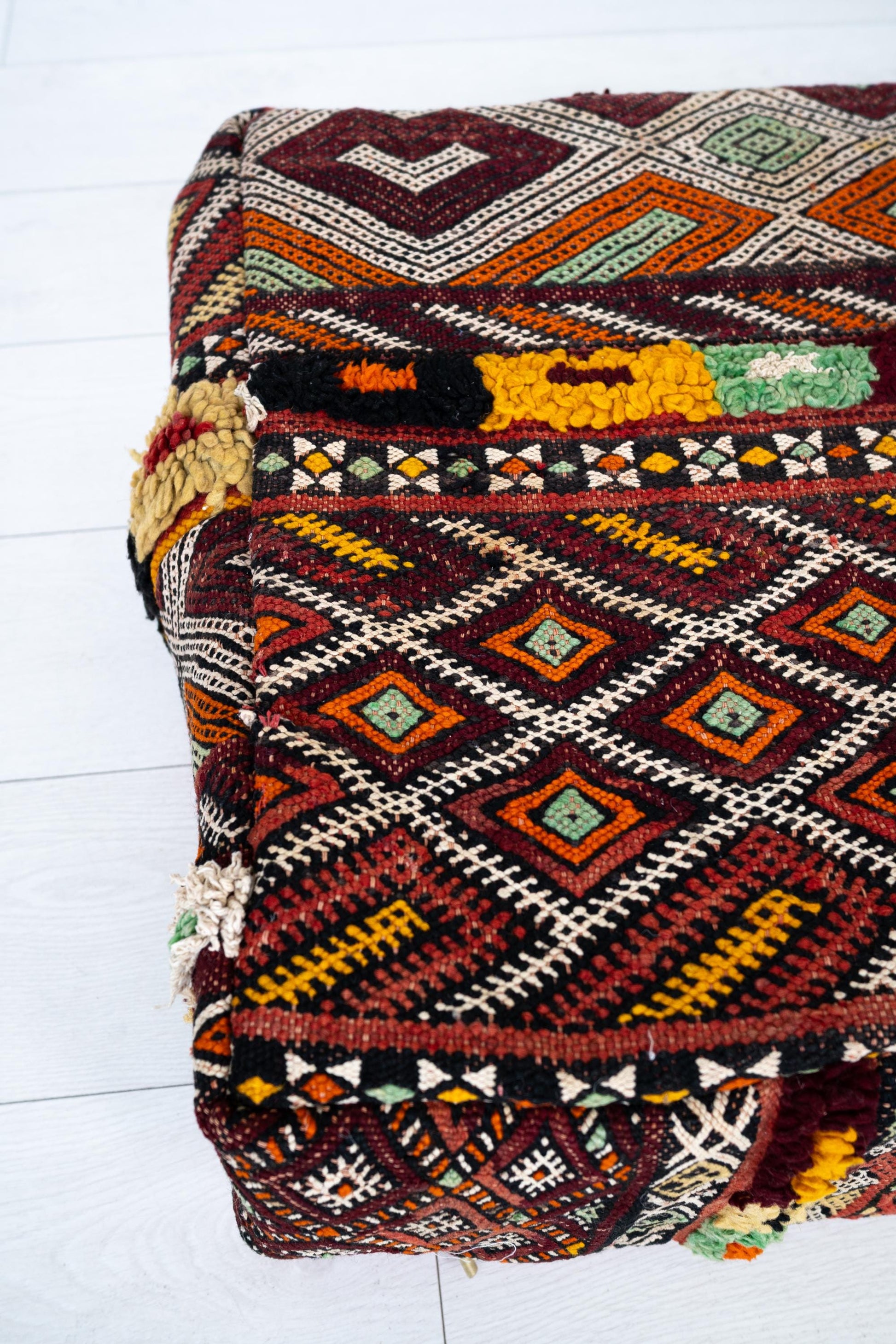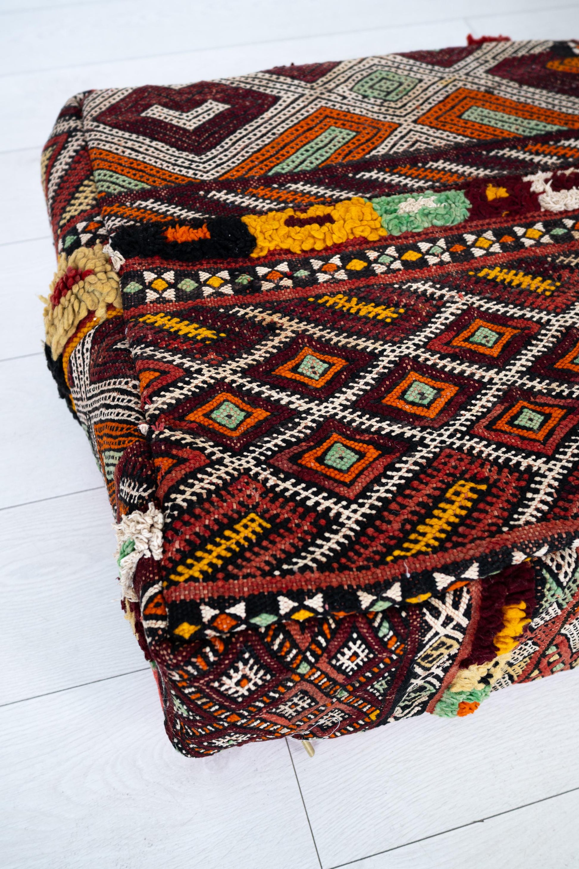 Infuse your home with warmth and versatility through this handmade Moroccan floor pouf. Sized at 24"x24"x8", it's crafted from upcycled vintage wool rugs and designed for flexible, stylish living. The earthy tones and tribal motifs bring soulful character to any room—perfect for cozy corners, curated lounges, or sunlit studios.
