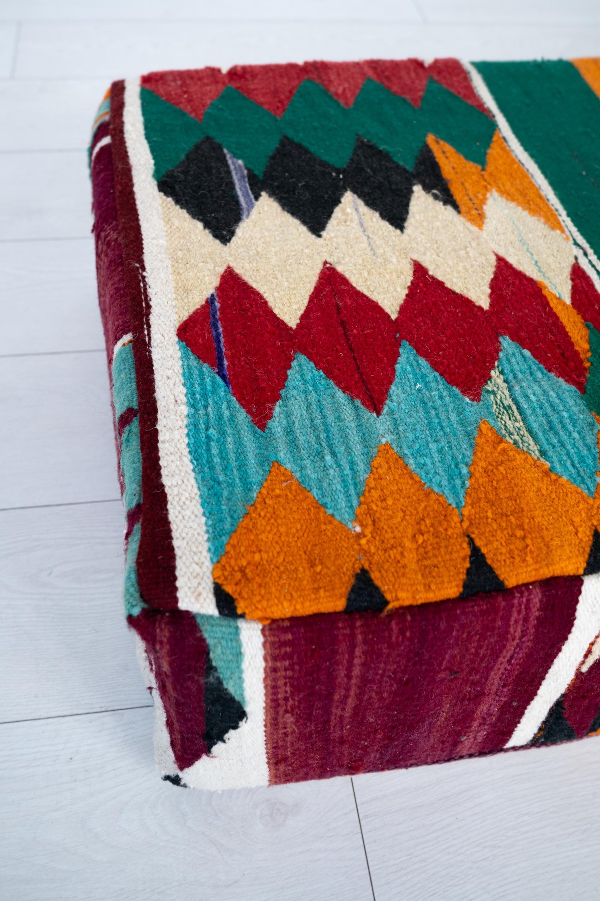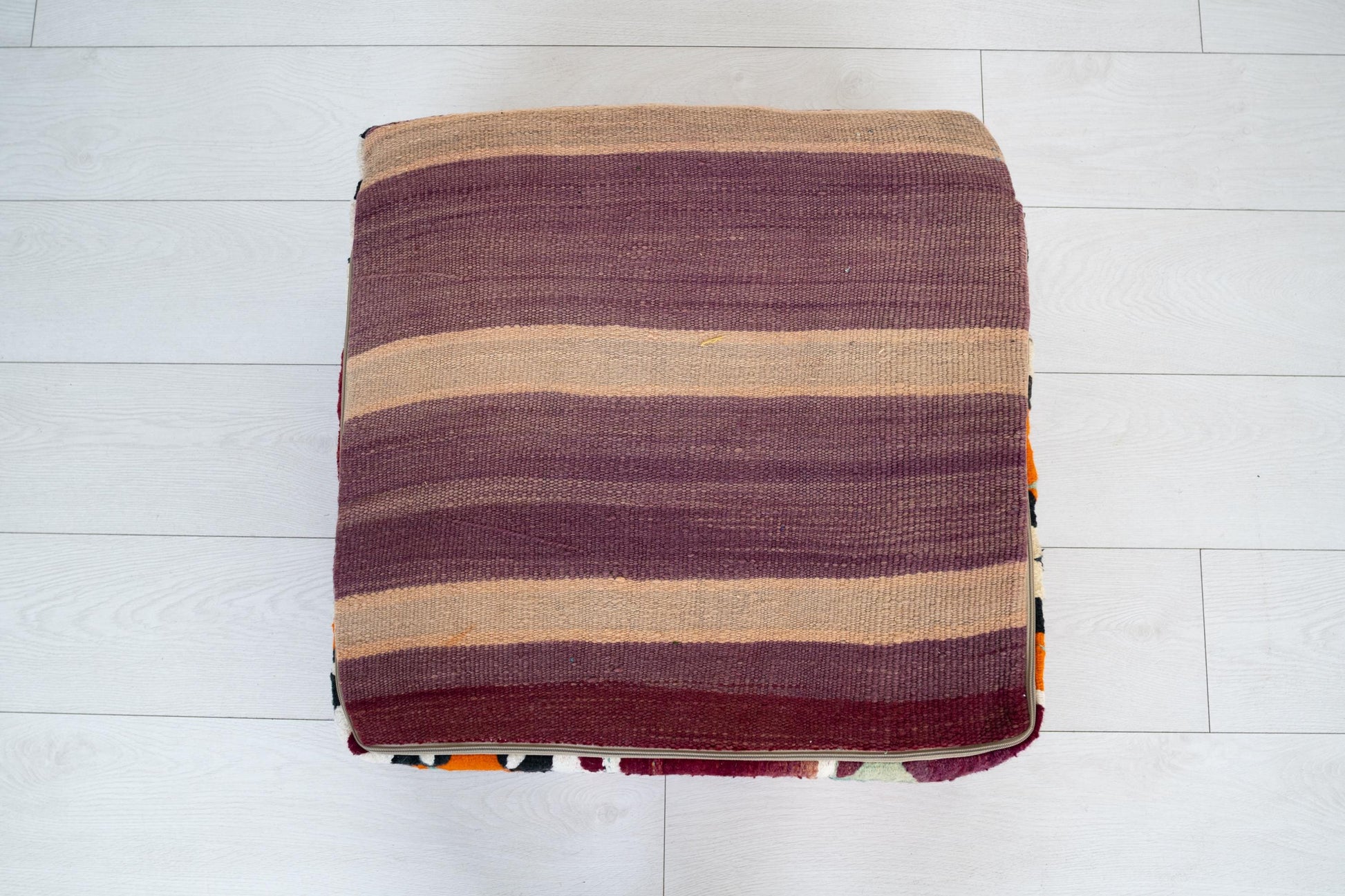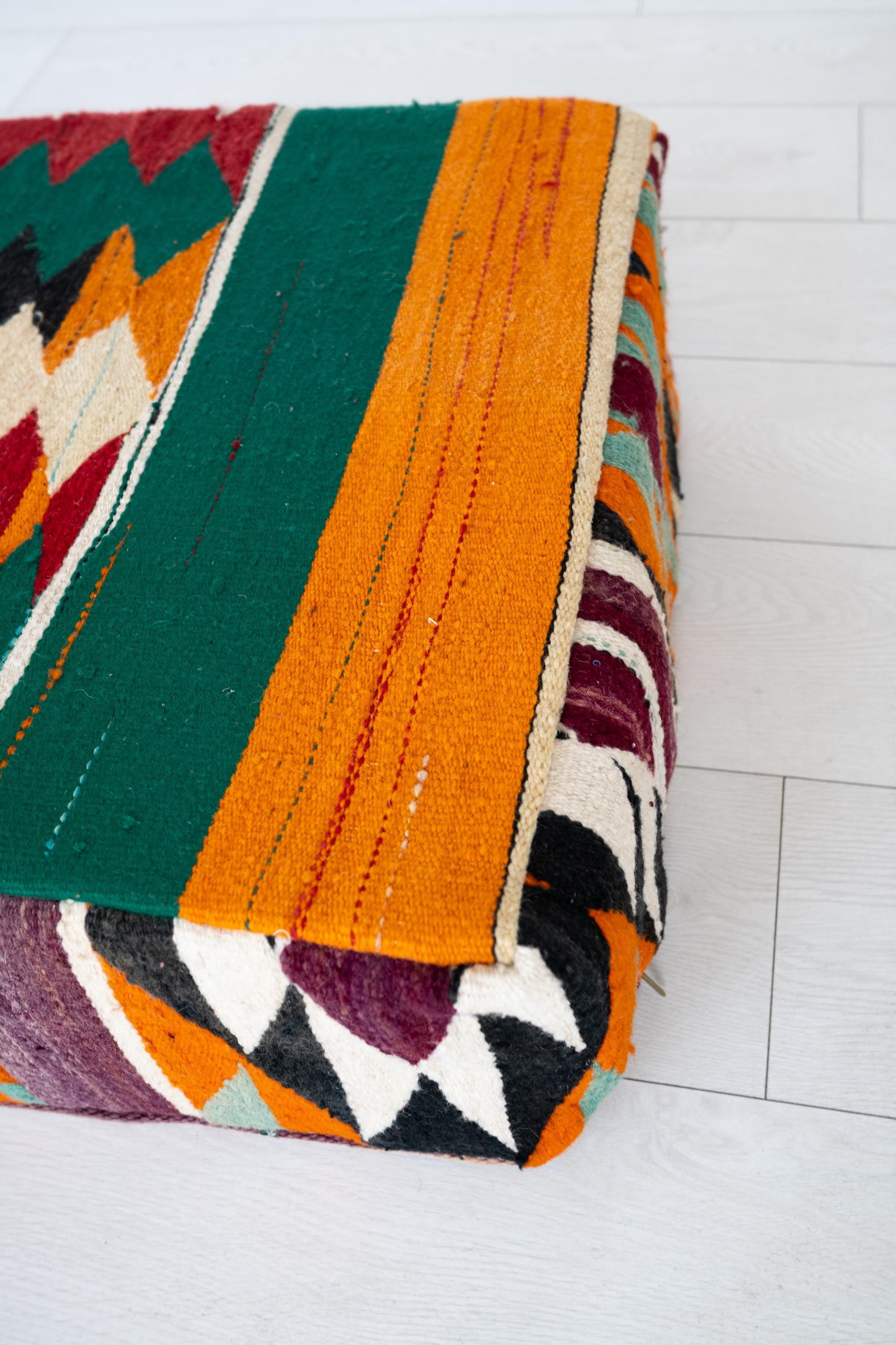 Infuse your home with warmth and versatility through this handmade Moroccan floor pouf. Sized at 24"x24"x8", it's crafted from upcycled vintage wool rugs and designed for flexible, stylish living. The earthy tones and tribal motifs bring soulful character to any room—perfect for cozy corners, curated lounges, or sunlit studios.