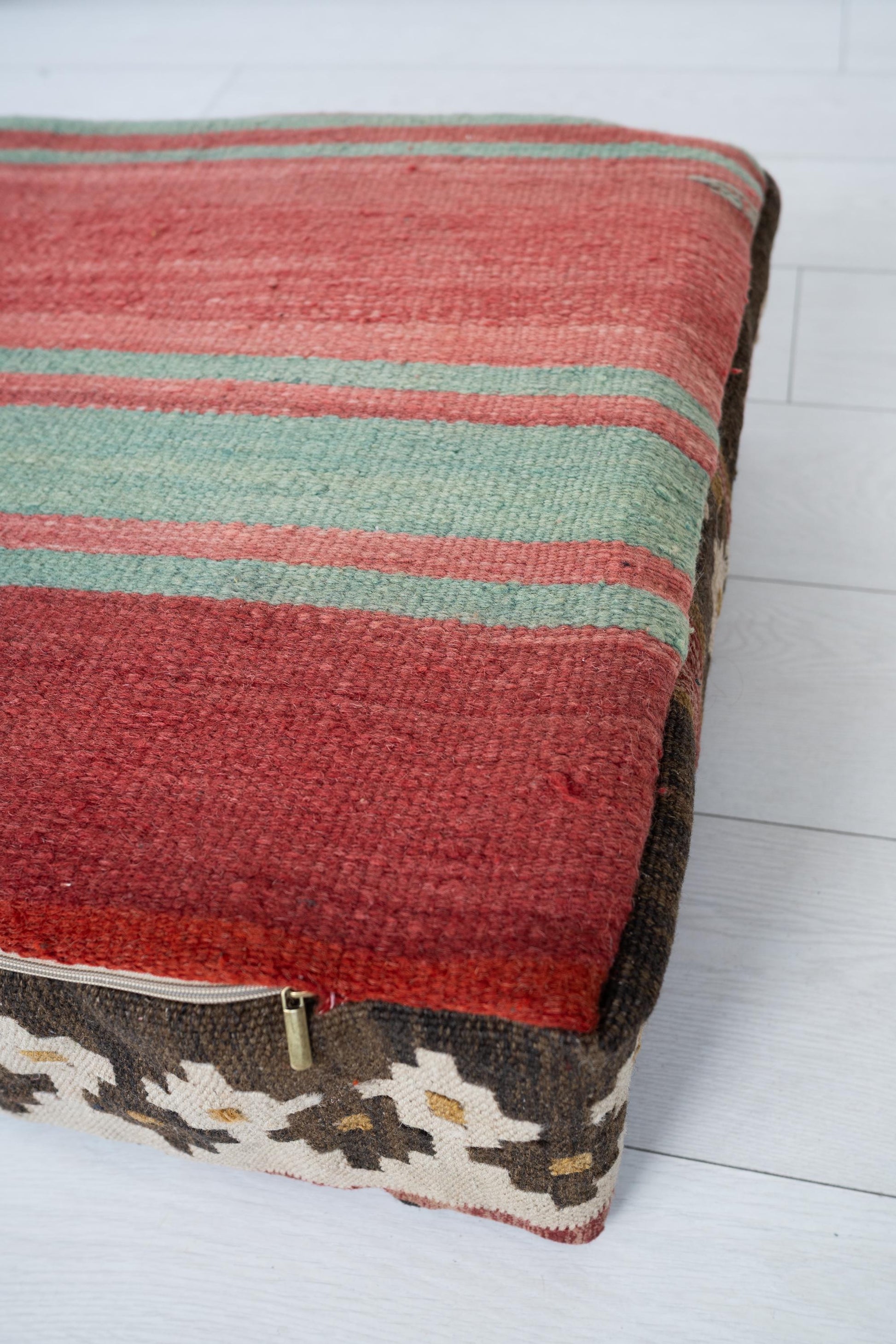 Infuse your home with warmth and versatility through this handmade Moroccan floor pouf. Sized at 24"x24"x8", it's crafted from upcycled vintage wool rugs and designed for flexible, stylish living. The earthy tones and tribal motifs bring soulful character to any room—perfect for cozy corners, curated lounges, or sunlit studios.