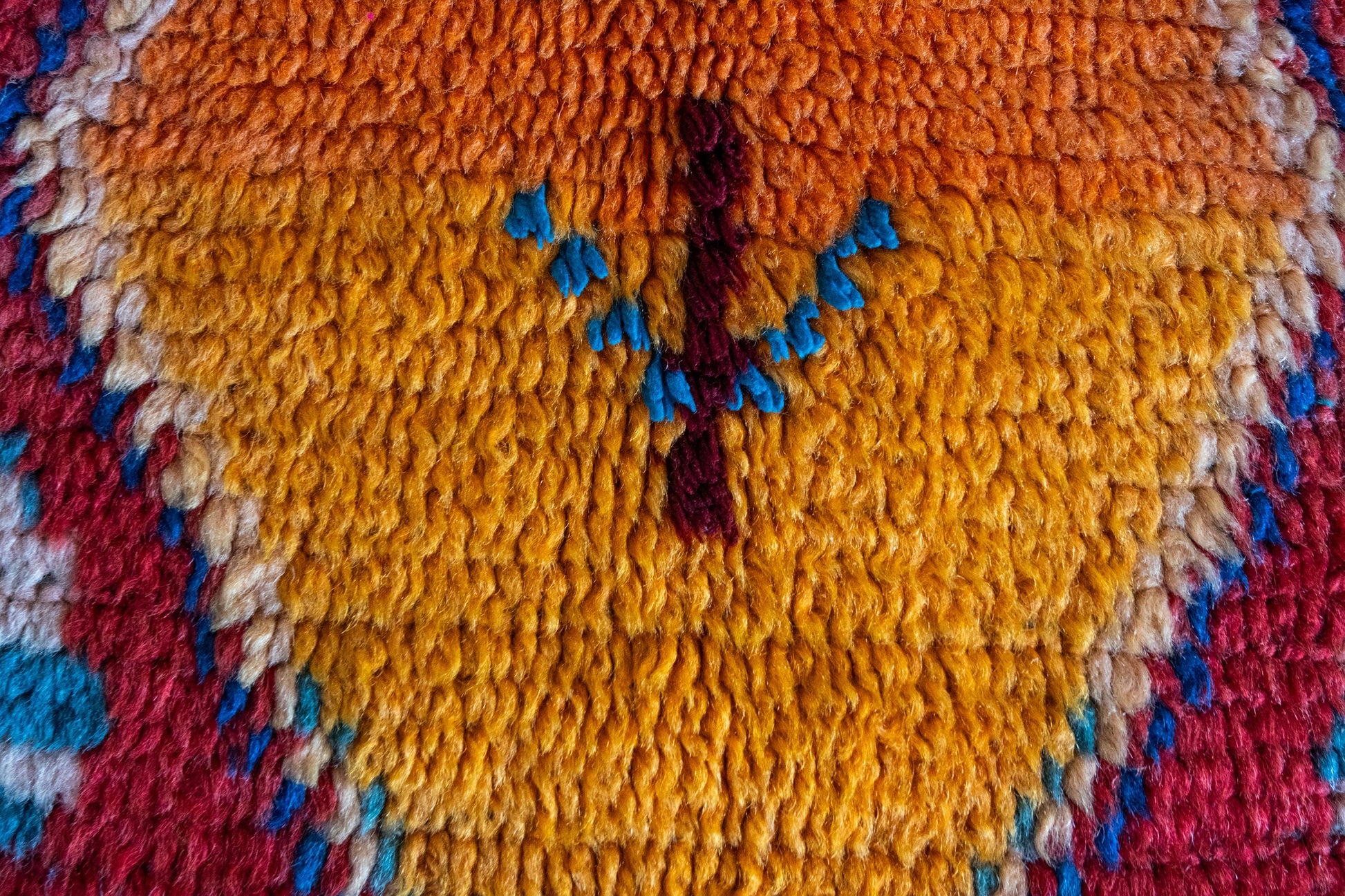 The rug’s warm hues—such as terracotta, sand, ochre, and deep reds—echo the sun-drenched landscapes of the American Southwest, effortlessly pairing with adobe walls, rustic wooden furniture, and desert-inspired decor. Berber symbols and tribal patterns add a layer of cultural depth, reminiscent of both Moroccan artistry and the free-spirited essence of Southwest design. Woven from high-quality natural wool, this accent rug provides a plush feel underfoot while maintaining durability, ideal for layering in cozy spaces, entryways, or reading nooks.