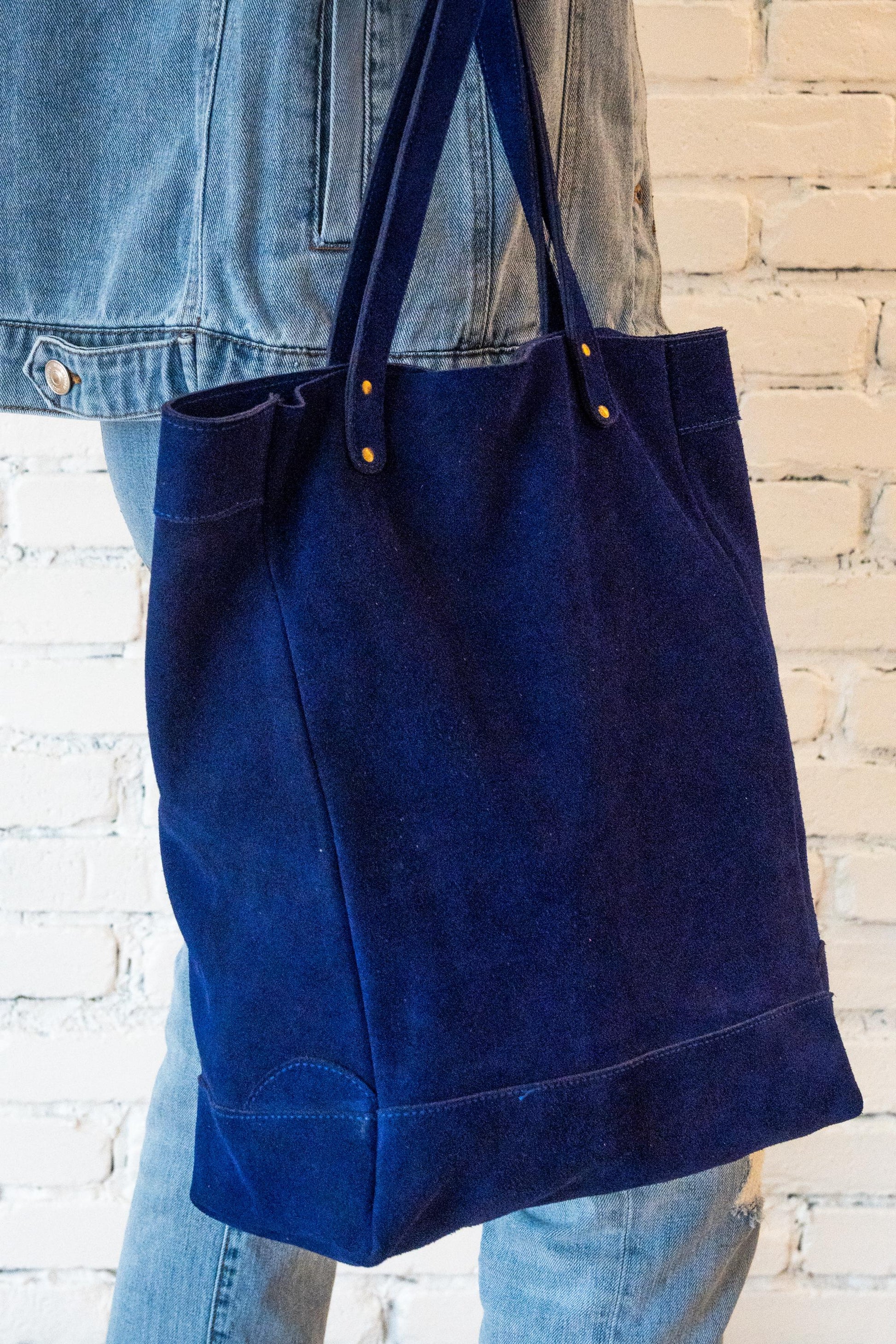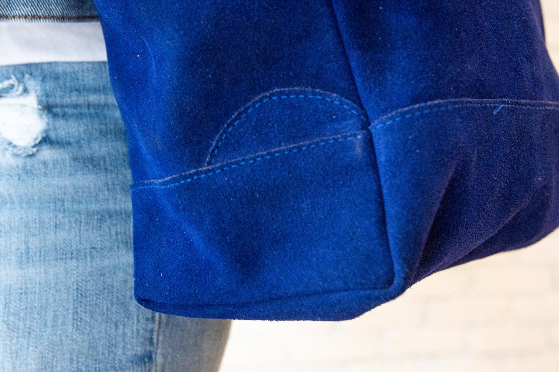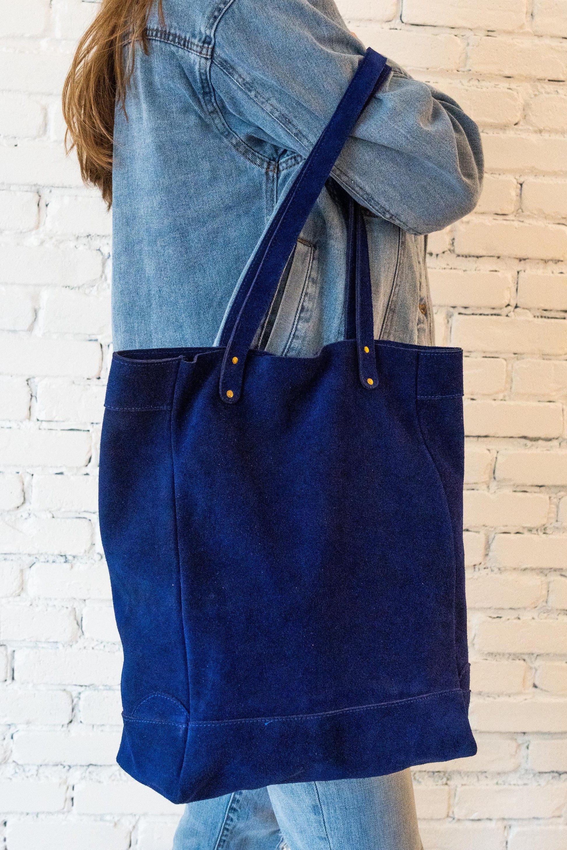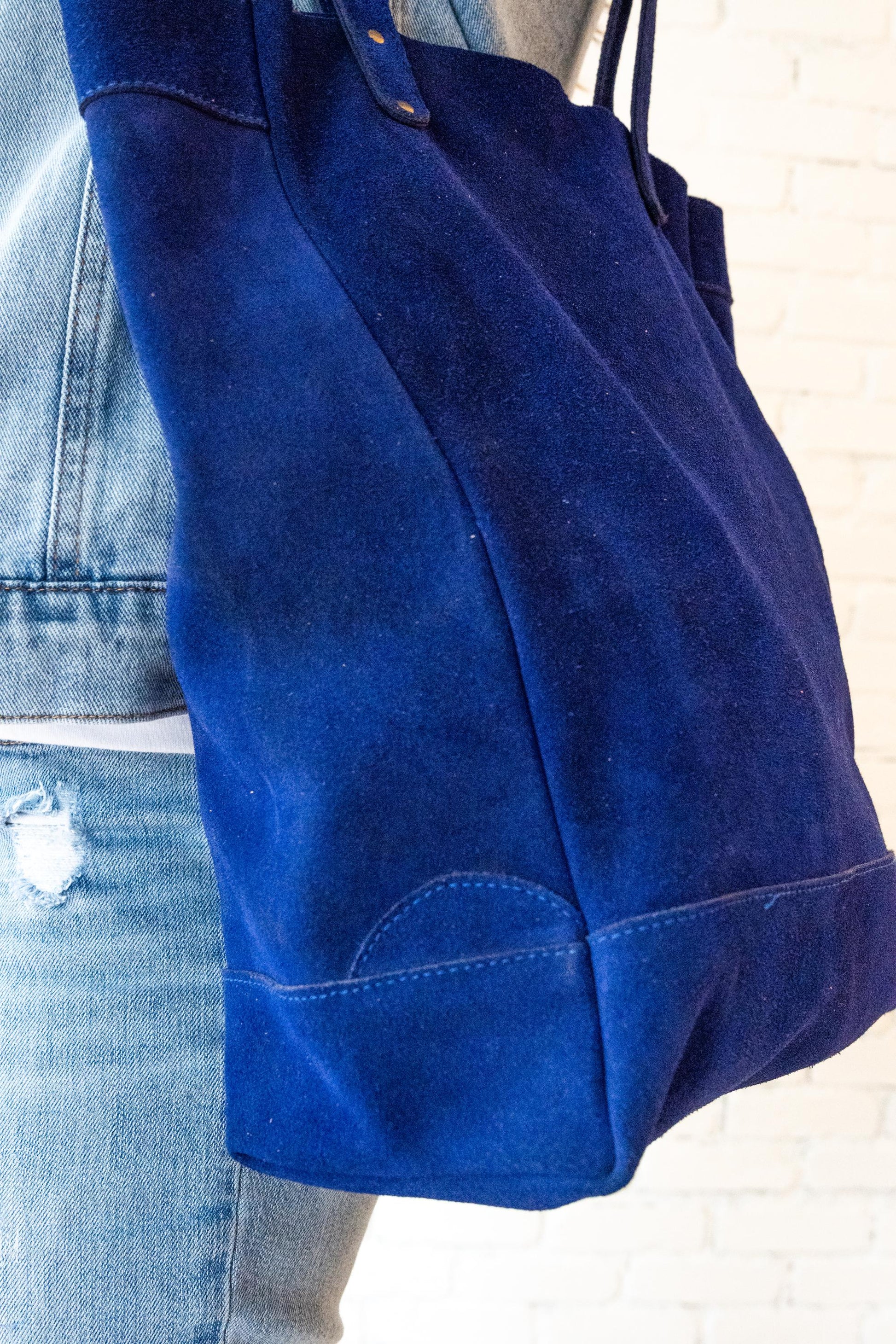 This Majorelle blue suede tote is a sophisticated blend of vibrant color and masterful craftsmanship, handcrafted in Morocco. Its striking hue, inspired by the iconic Majorelle Garden, makes it a statement piece that captures attention effortlessly. Designed for both beauty and utility, the tote boasts sturdy leather straps and a spacious interior, perfect for carrying daily essentials. Reinforced stitching ensures durability, while the premium suede material adds a touch of luxury to your collection. An elegant nod to Moroccan artistry, this tote seamlessly marries tradition with modern style.