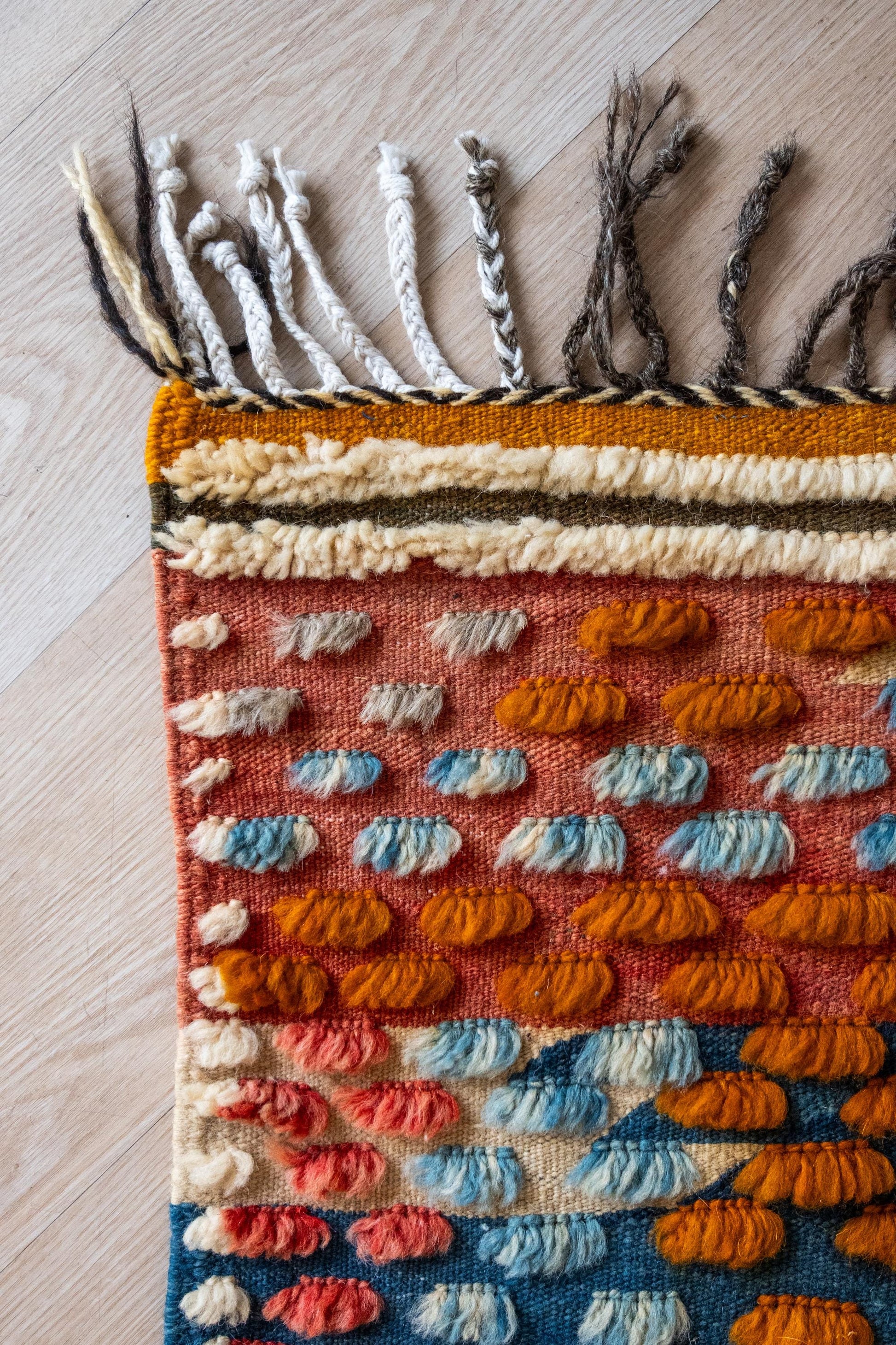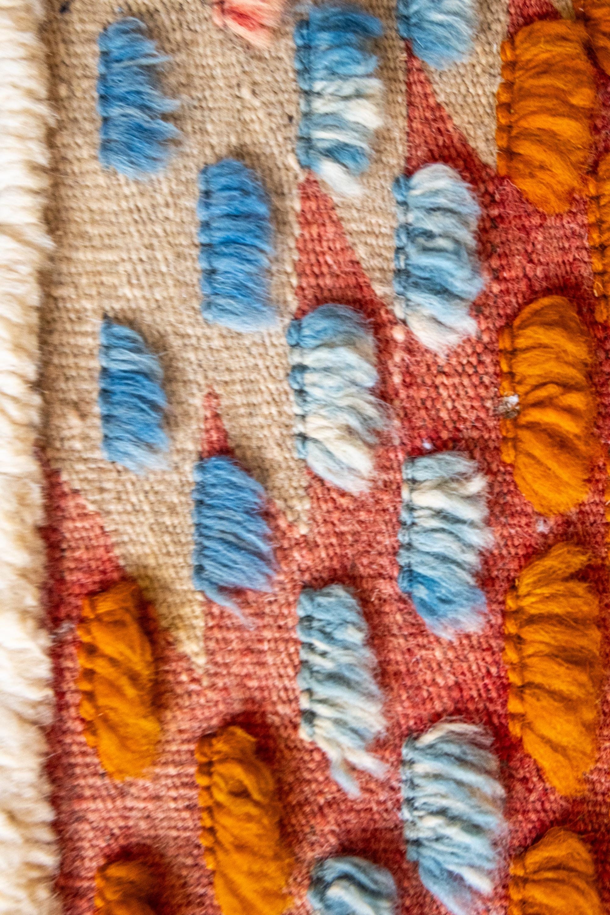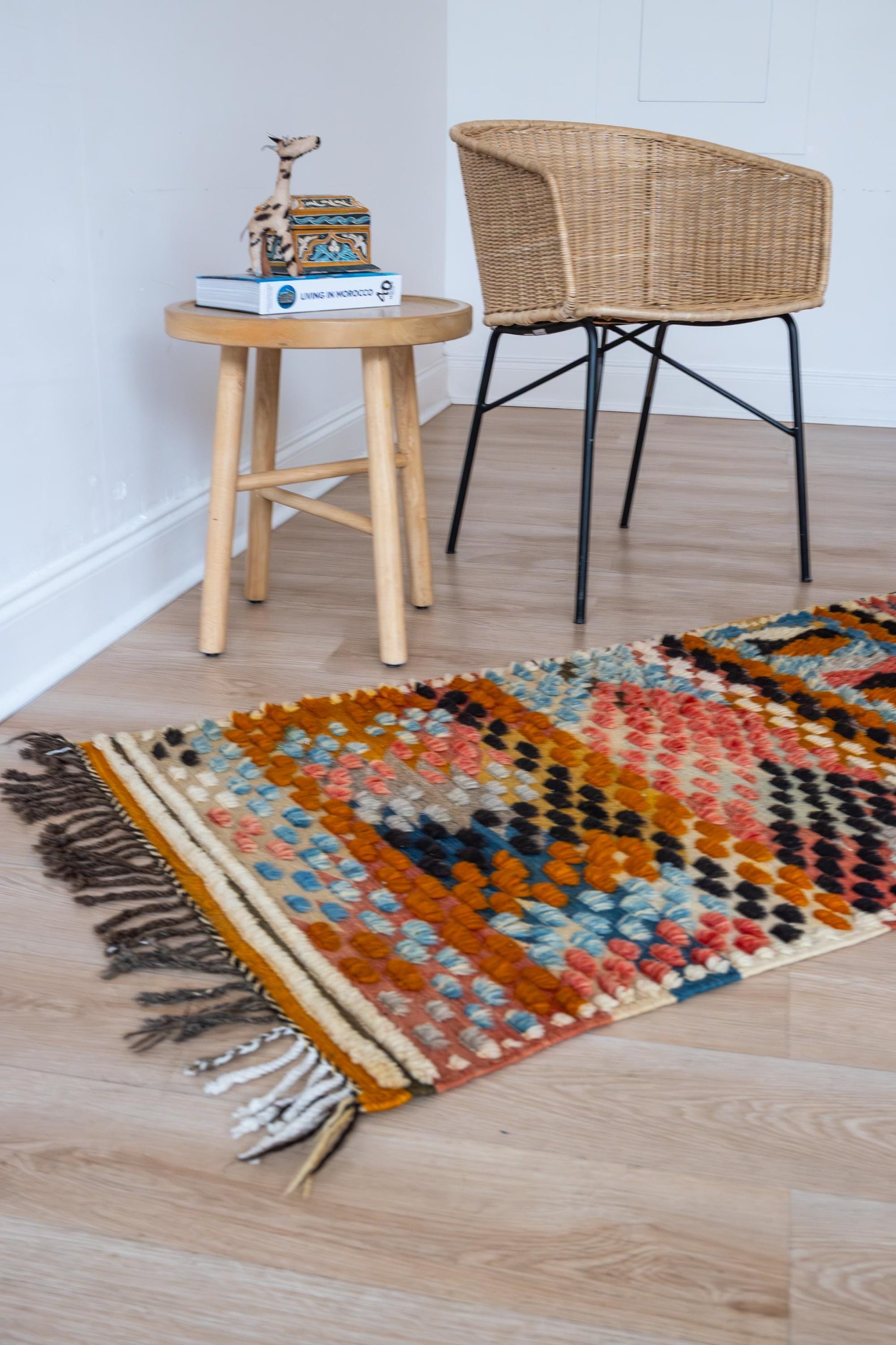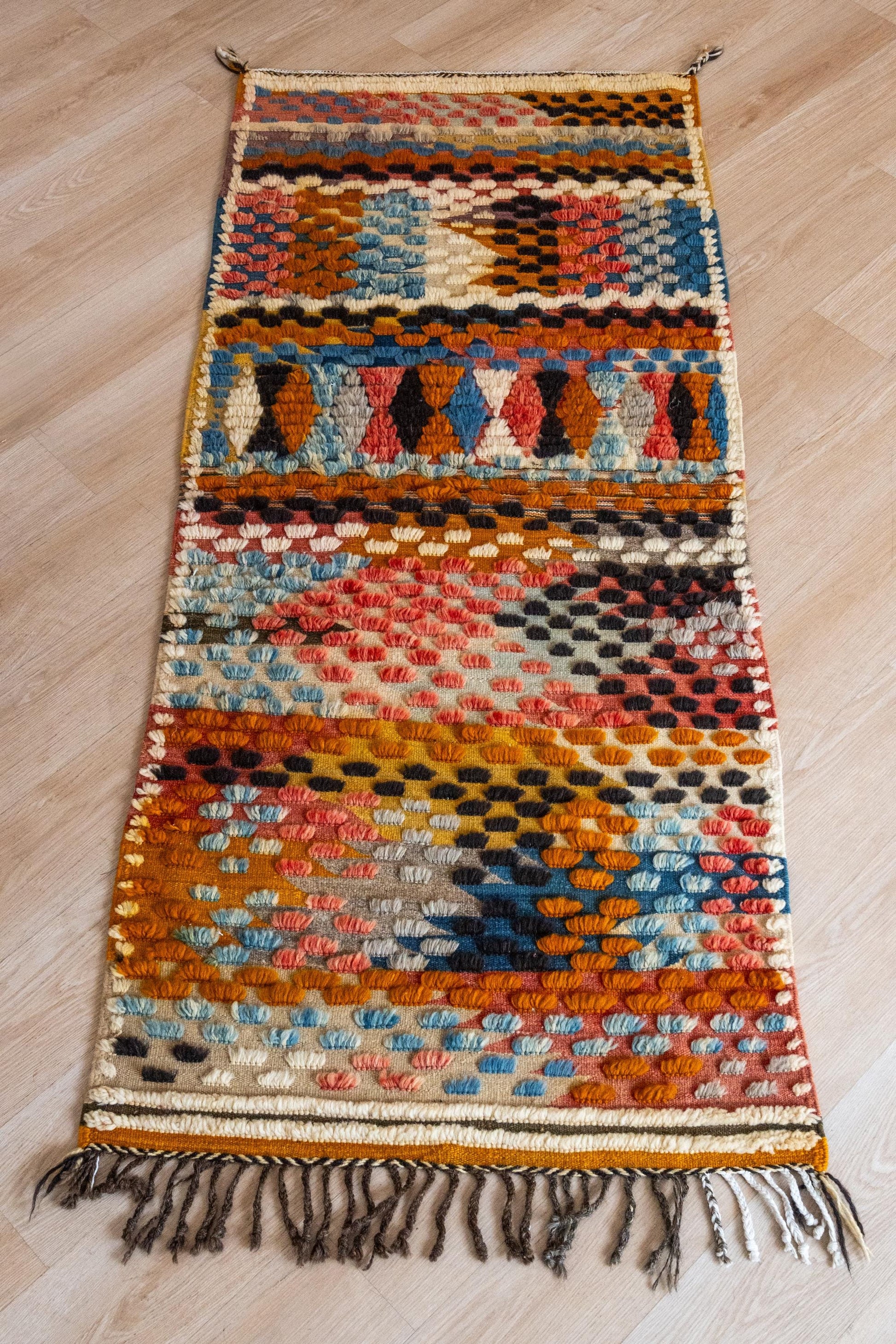 The runner features bold geometric motifs, meticulously woven into a foundation of warm earth tones, deep reds, and soft golds—a nod to the sun-drenched landscapes of Morocco. Delicate diamond accents bring a refined balance, adding visual depth and movement to the design. Made from 100% natural wool, its plush texture provides comfort underfoot while ensuring long-lasting durability.