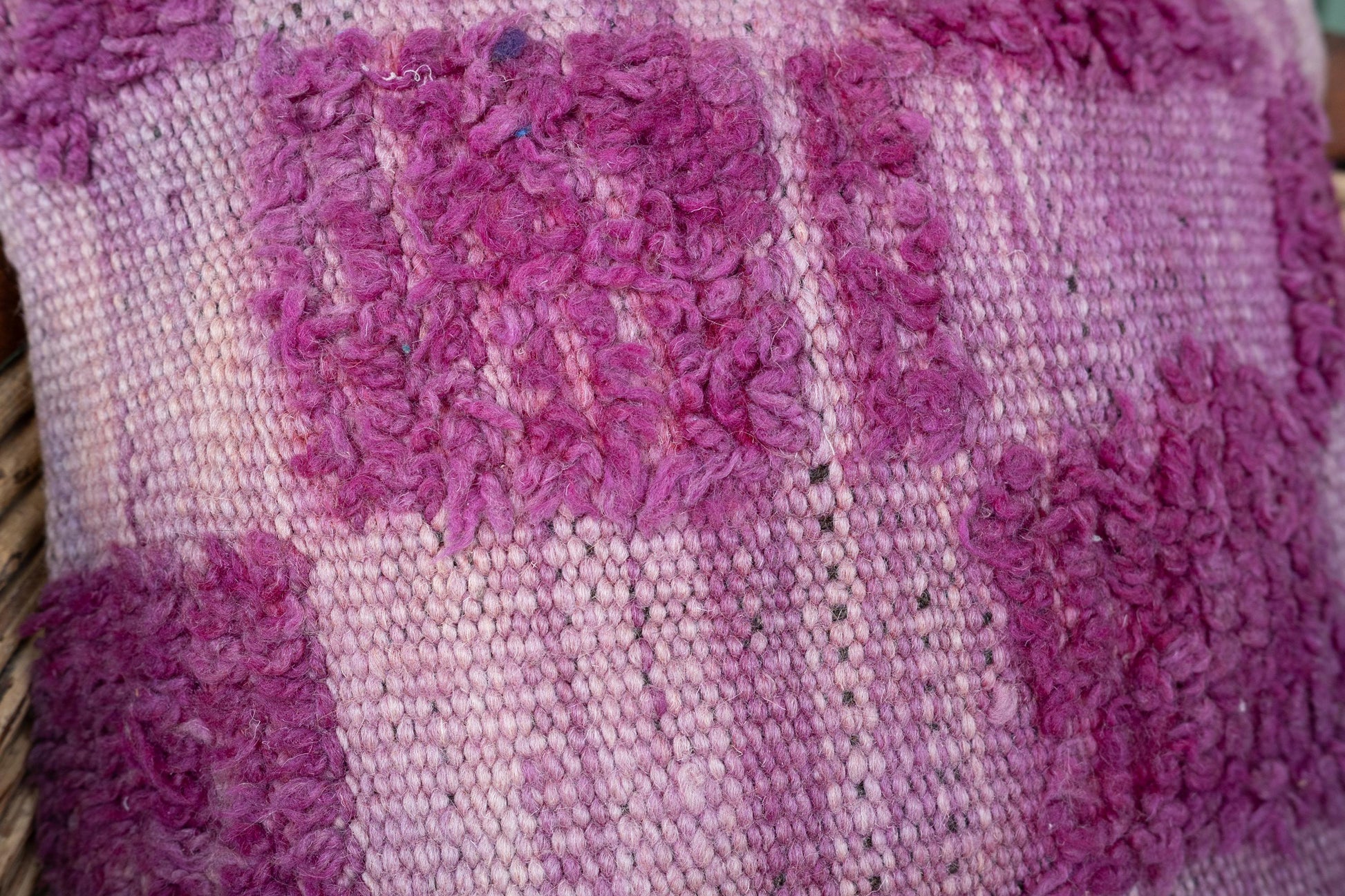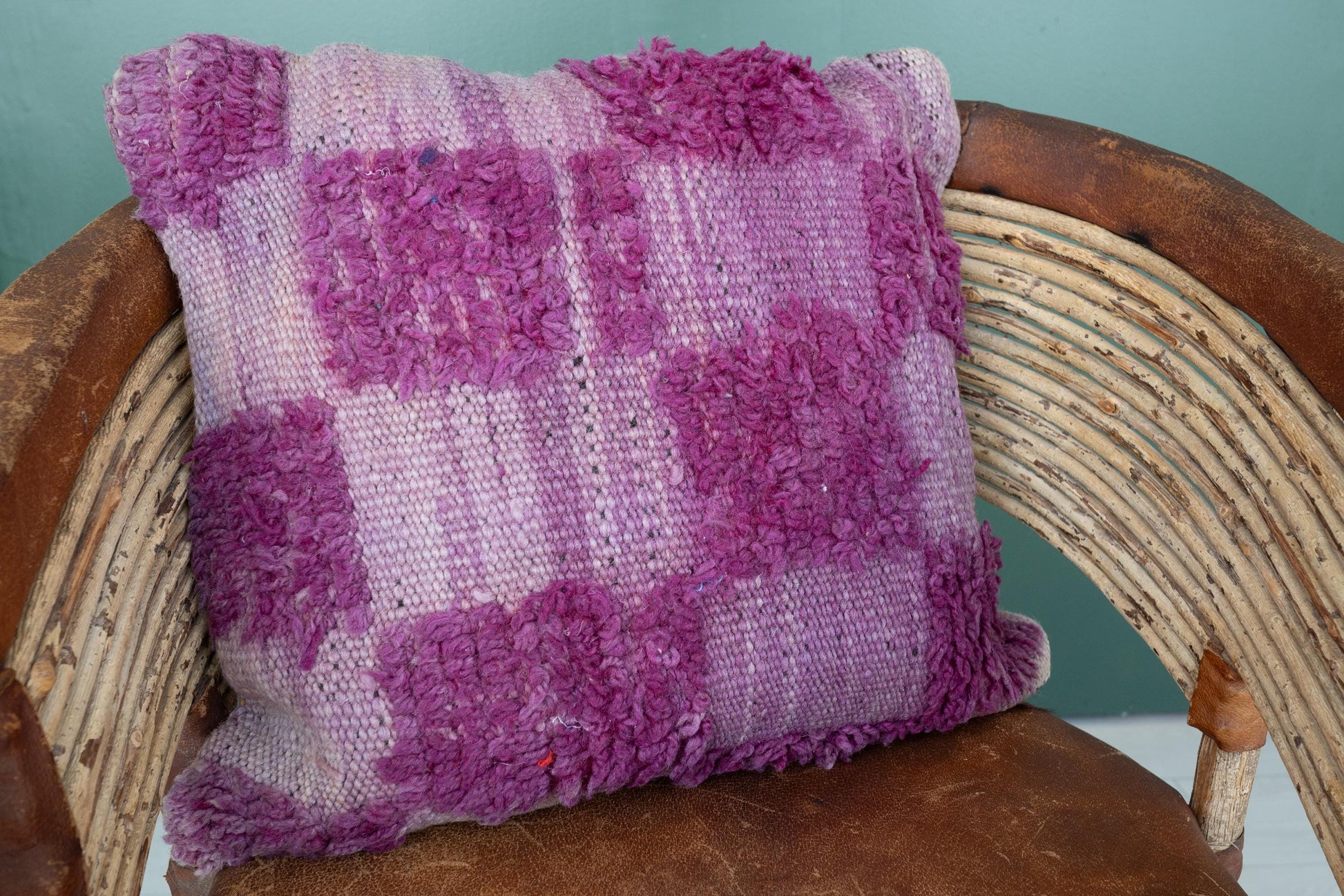Bring warmth, texture, and timeless artistry into your home with this handmade Moroccan pillow cover, reimagined from a vintage Berber rug. Woven in rich plum and violet tones, it features a bold checkered pattern that plays with high and low pile textures—offering a tactile feast that’s both grounding and visually striking.