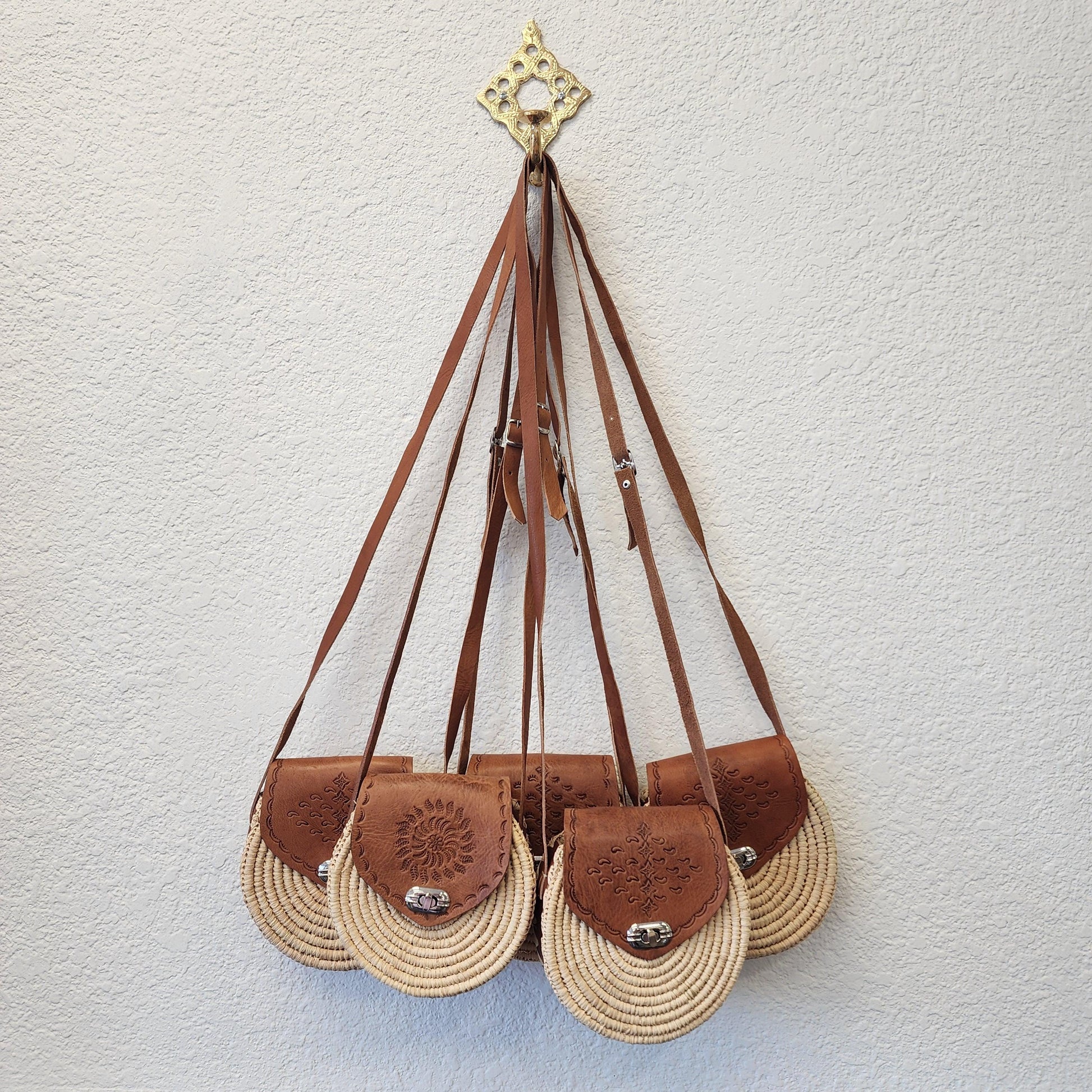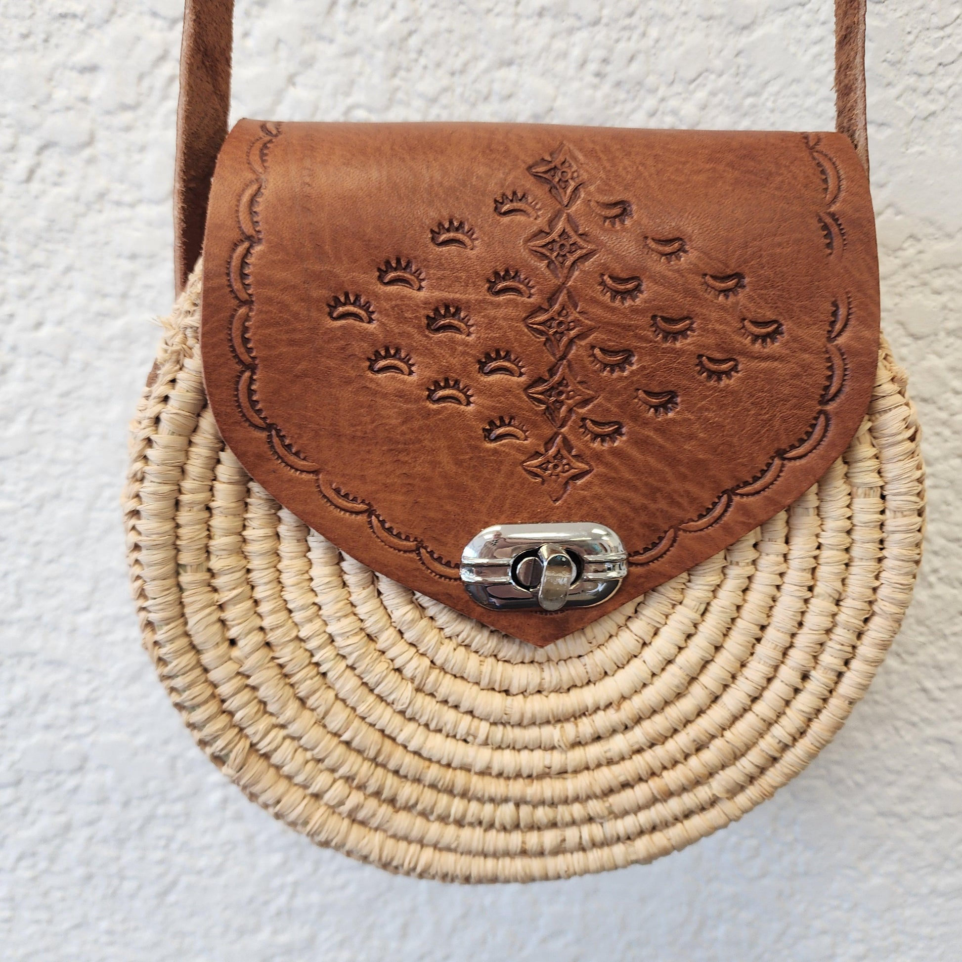 Crafted in Essaouira, Morocco, this round satchel is a stunning fusion of tradition and coastal charm. Hand-tooled genuine leather meets hand-crocheted raffia, creating a lightweight yet durable purse that’s perfect for summer adventures, beach days, and boho-inspired outfits.