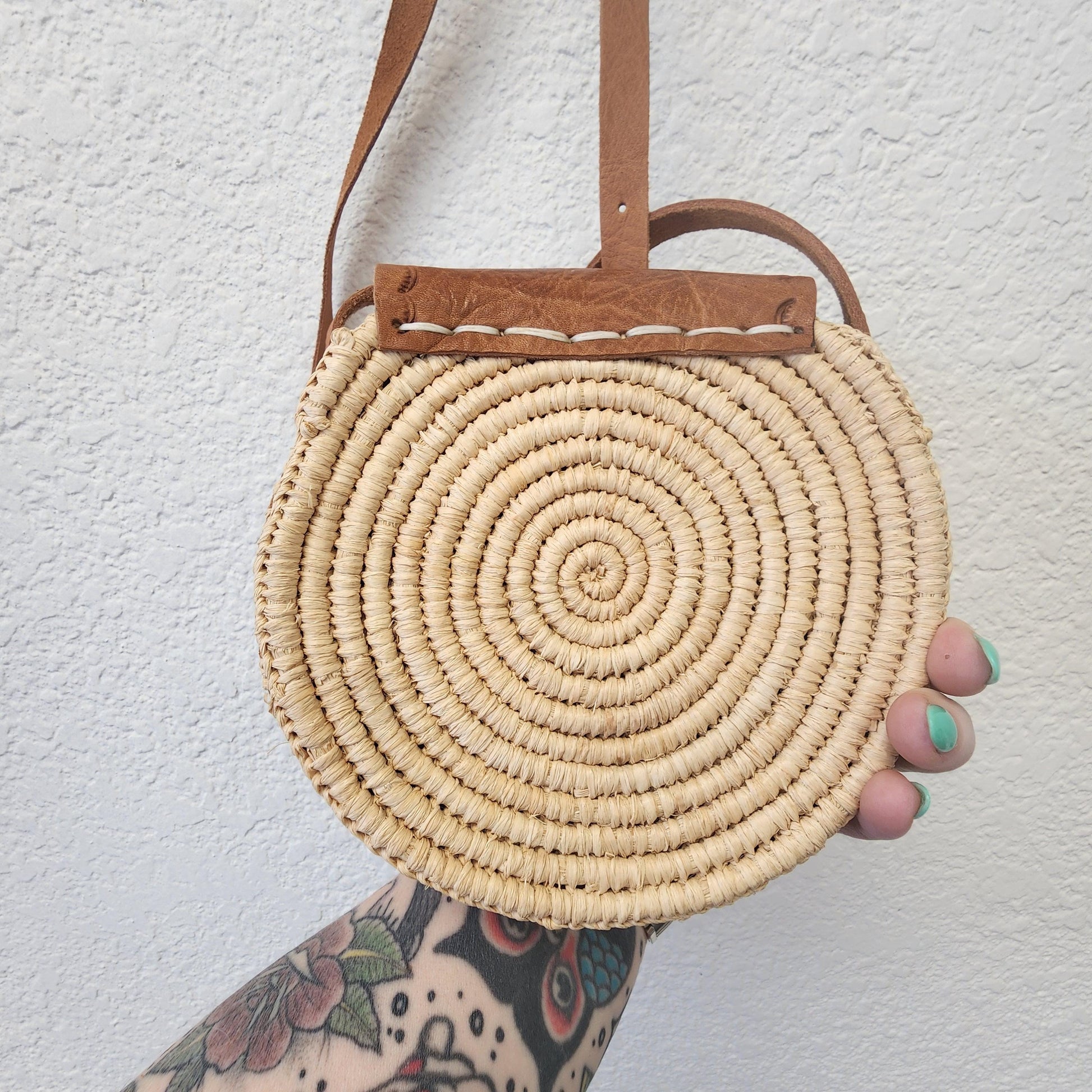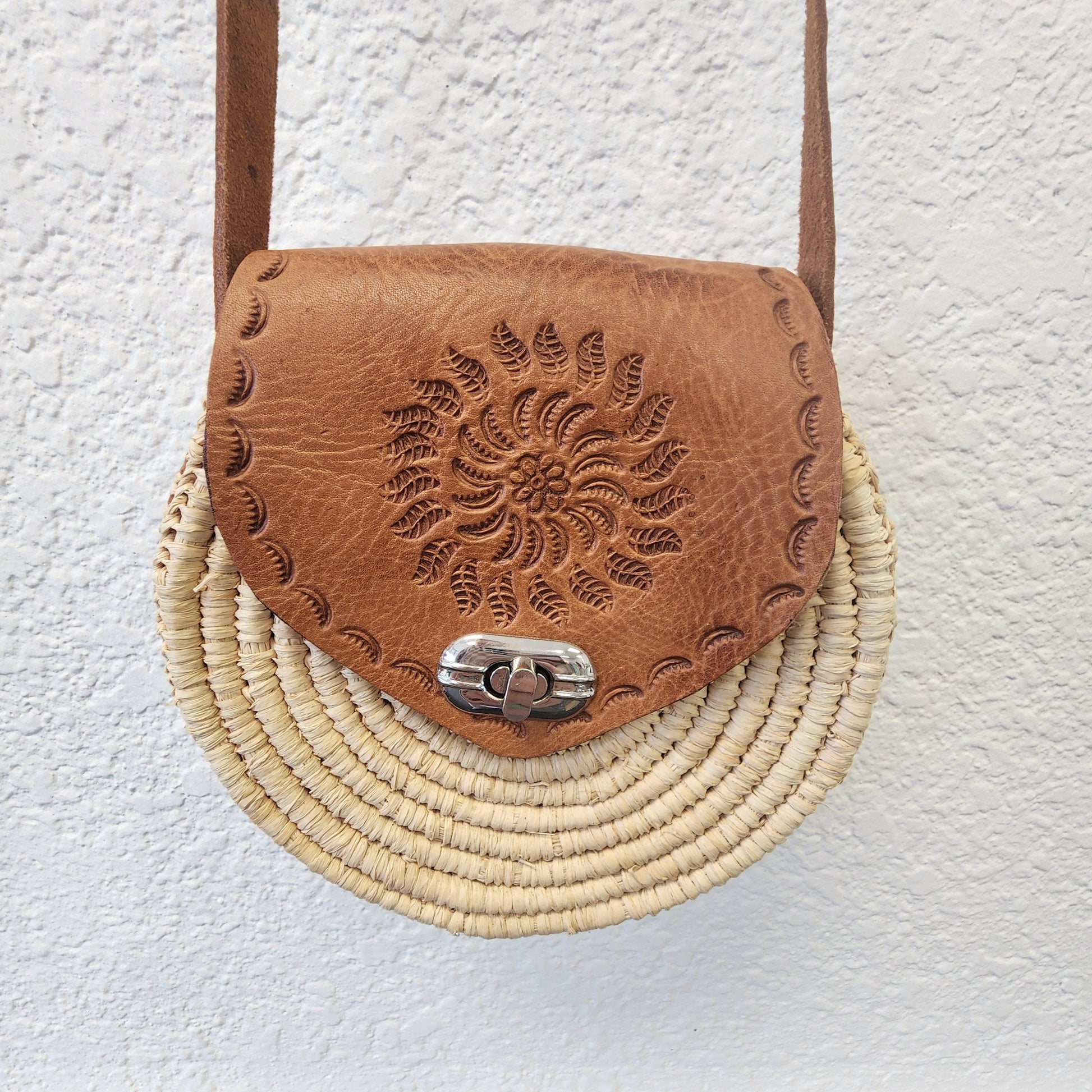 Unique Handmade Moroccan Round Leather Raffia Satchel - Tooled, Beachy Purse from Essaouira, Morocco