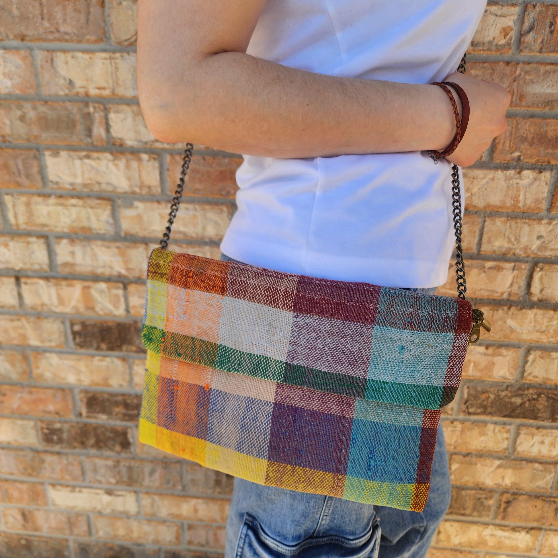 Small fold over crossbody made of vintage, handwoven Moroccan haik blankets. Removable 52 in leather and chain strap. Lined with contrast floral pattern. Quality hardware.