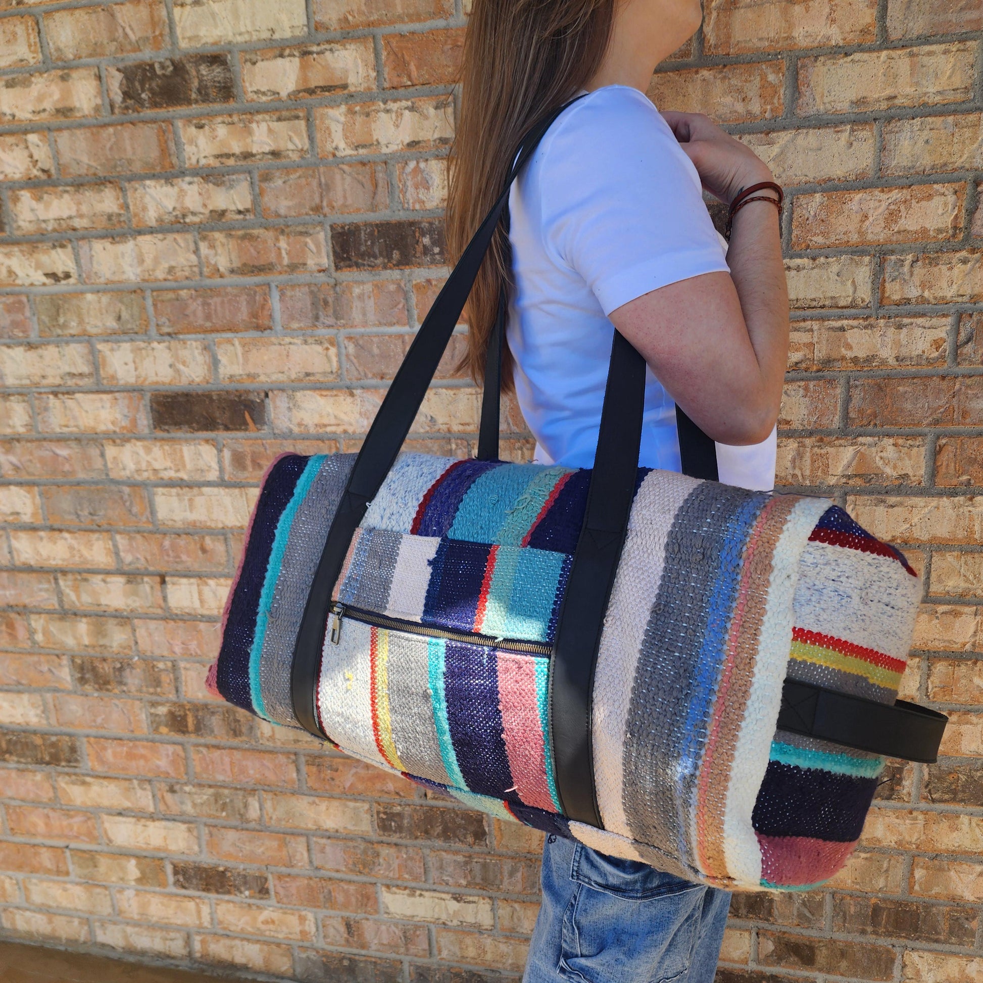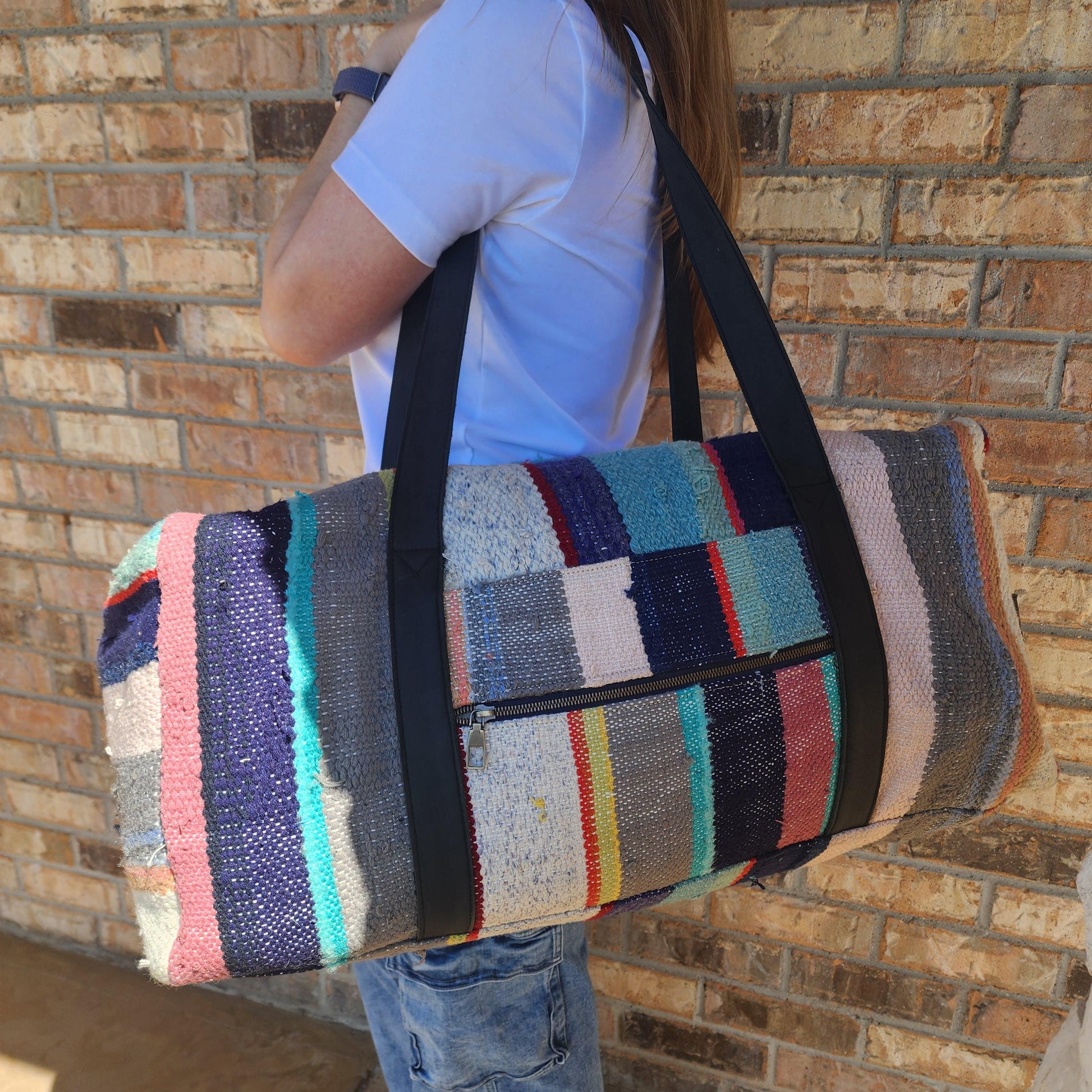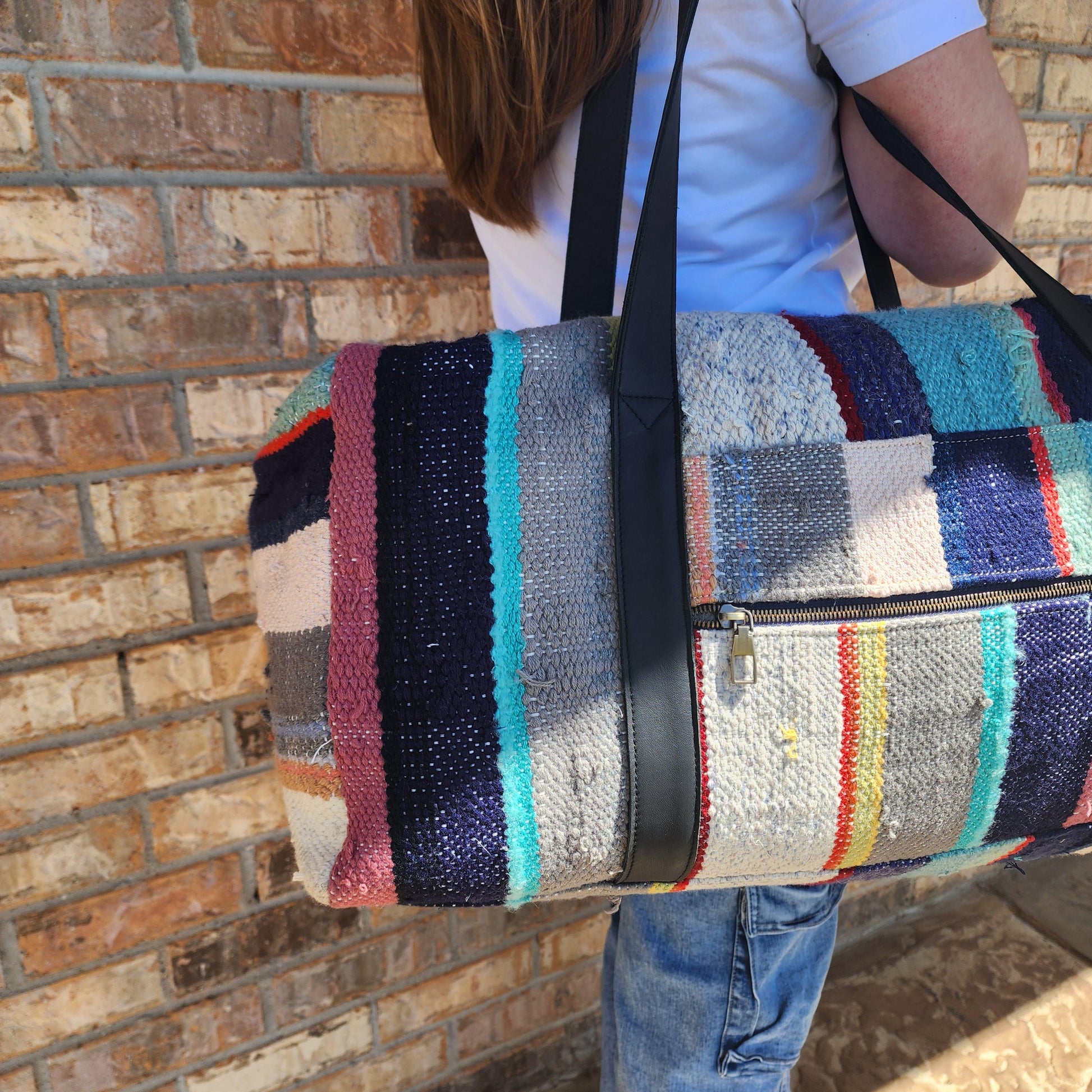 Upcylced, handwoven blanket duffle bag, made in Morocco.